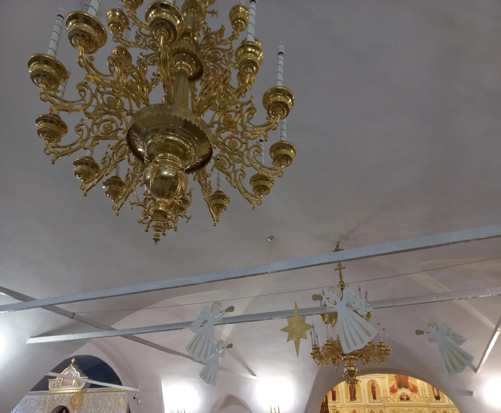 Ниже и справа просматривается второе, меньшее по размеру паникадило, что характерно для устройства крупных соборных храмов. Особого внимания заслуживают уникальные декоративные элементы, подвешенные к сводам: скульптурные изображения ангелов и звезда, символизирующие Вифлеемскую звезду и небесное воинство. Эти детали добавляют интерьеру особую духовную выразительность и свидетельствуют о высоком мастерстве сибирских artisans.