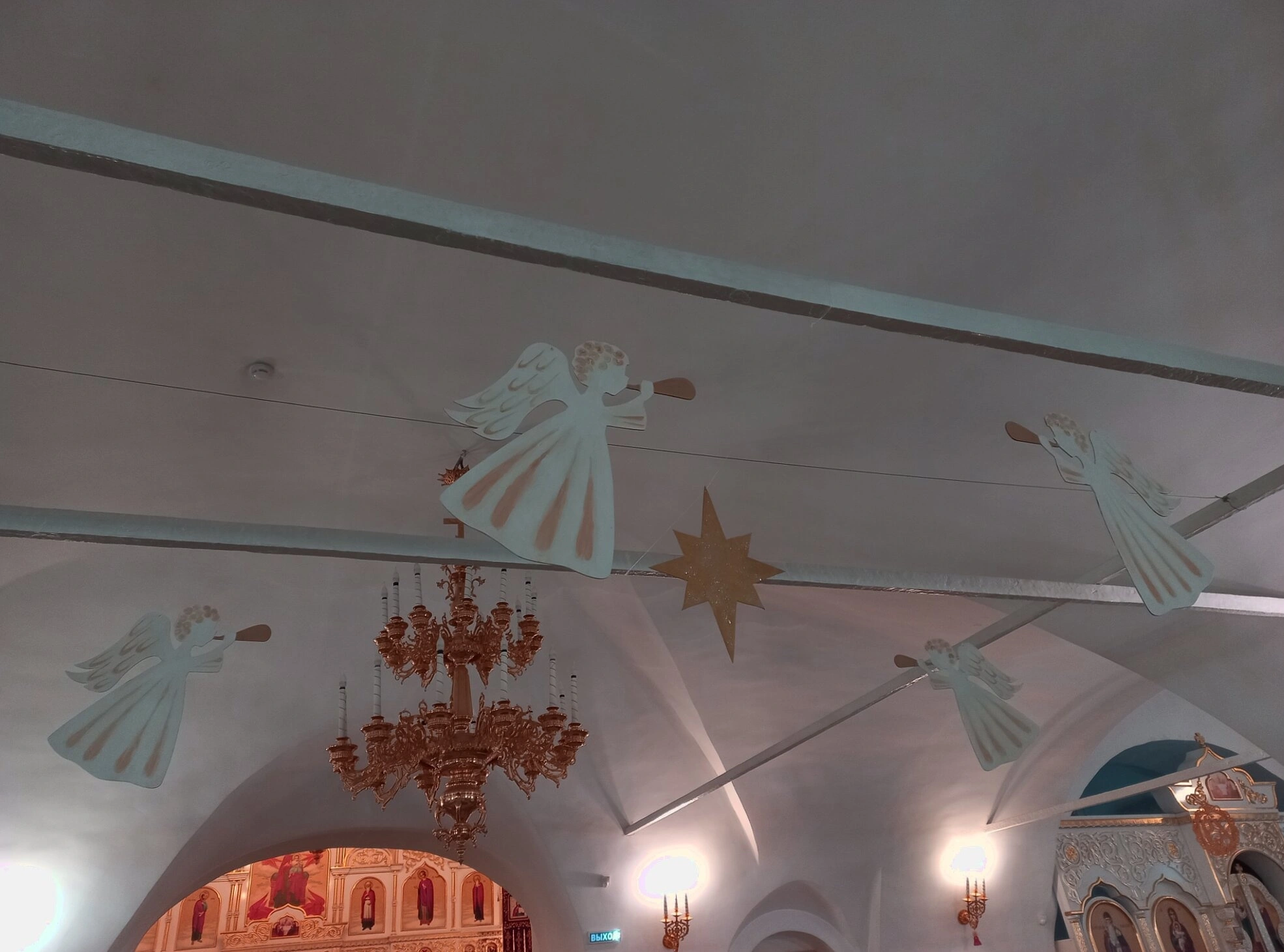 В центре композиции изображения находится массивное золочёное паникадило — храмовая люстра, символизирующая собой небесные силы и освещающая молитвенное пространство собора. Под потолком запечатлены декоративные элементы: фигуры ангелов, возвещающих благую весть, и сияющая Вифлеемская звезда, указывающая путь к Рождеству Христову.