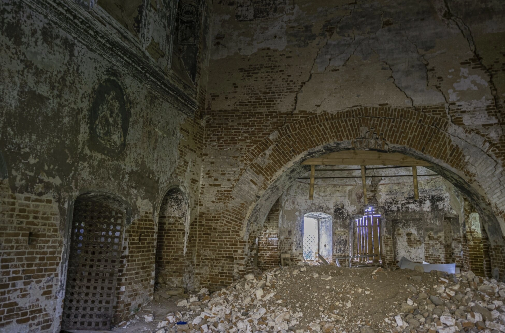 Пространство храма загромождено грудами обломков кирпича и строительного мусора, что является следствием частичного обрушения конструкций и долгих лет забвения. Отсутствие кровли и воздействие природных стихий довершили процесс разрушения, придав внутреннему убранству церкви суровый и величественный вид одновременно.