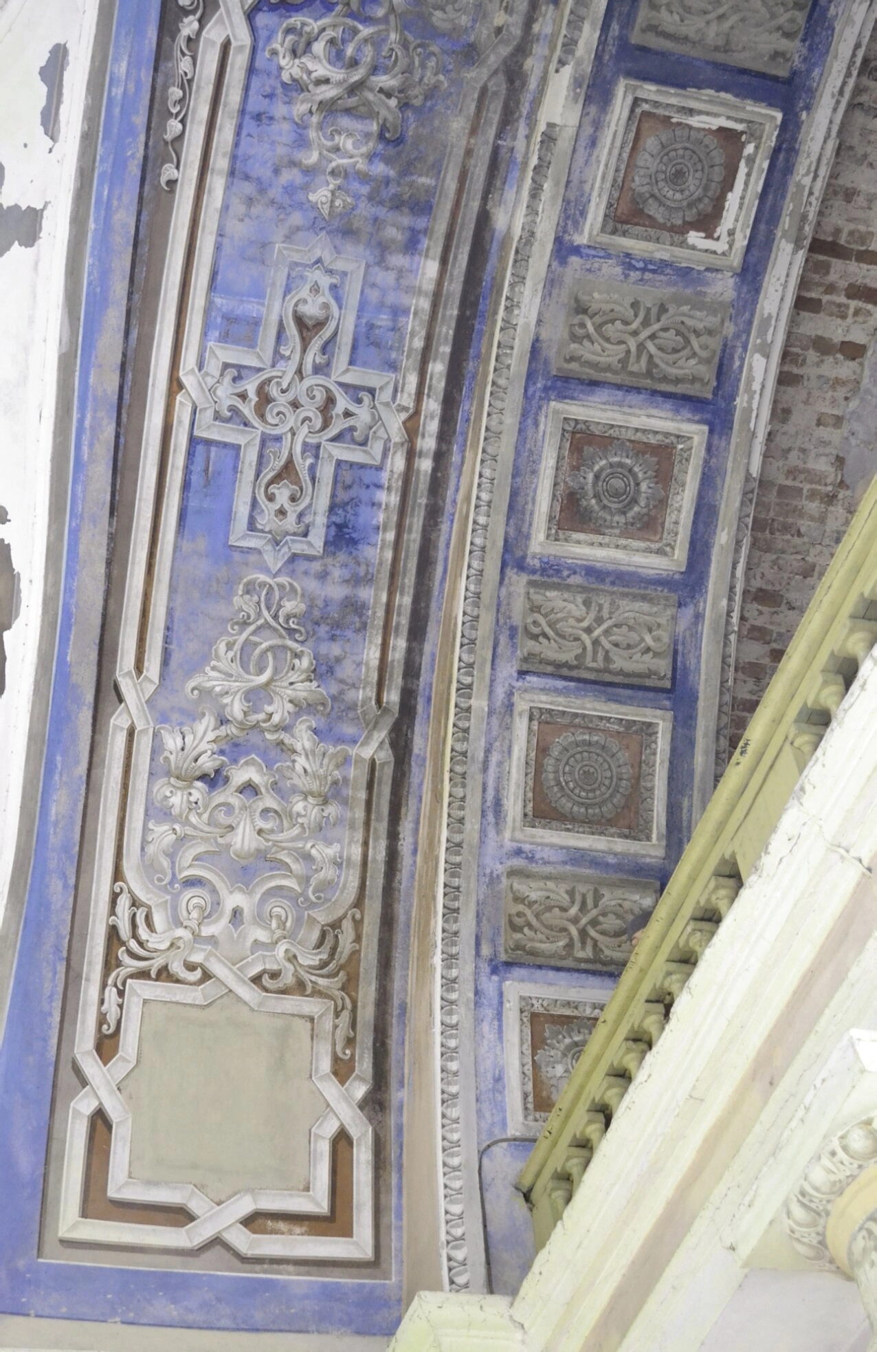 Правая часть изображения демонстрирует квадратные кессоны с вписанными в них круглыми медальонами. Каждый медальон и ячейка кессона украшены уникальной росписью, выполненной в традиционной для православной иконографии цветовой гамме: глубокие сине-голубые тона, символизирующие небесную чистоту, сочетаются с тёплой охрой и золотистыми оттенками, олицетворяющими божественный свет.