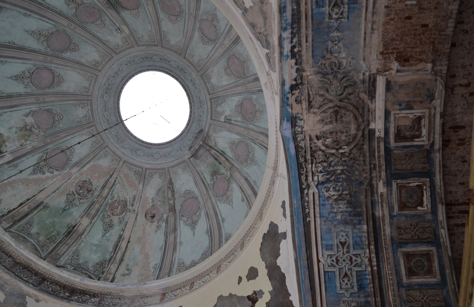 Свод купола украшен искусной лепниной и фрагментами старинной фресковой росписи, выполненной в мягких, пастельных тонах. Несмотря на повреждения, нанесённые временем и neglectом, угадываются очертания священных изображений, возможно, ликов святых или евангельских сцен, которые взирали на молящихся в годы расцвета этой святыни. На стенах, по правую сторону, также просматриваются следы декоративного убранства: орнаменты и сюжеты, ныне частично скрытые под слоями облупившейся штукатурки. Этот образ служит немым, но красноречивым свидетельством многовековой истории православия на русской земле, напоминая о тленности земного и о необходимости сохранения нашего духовного и культурного наследия.