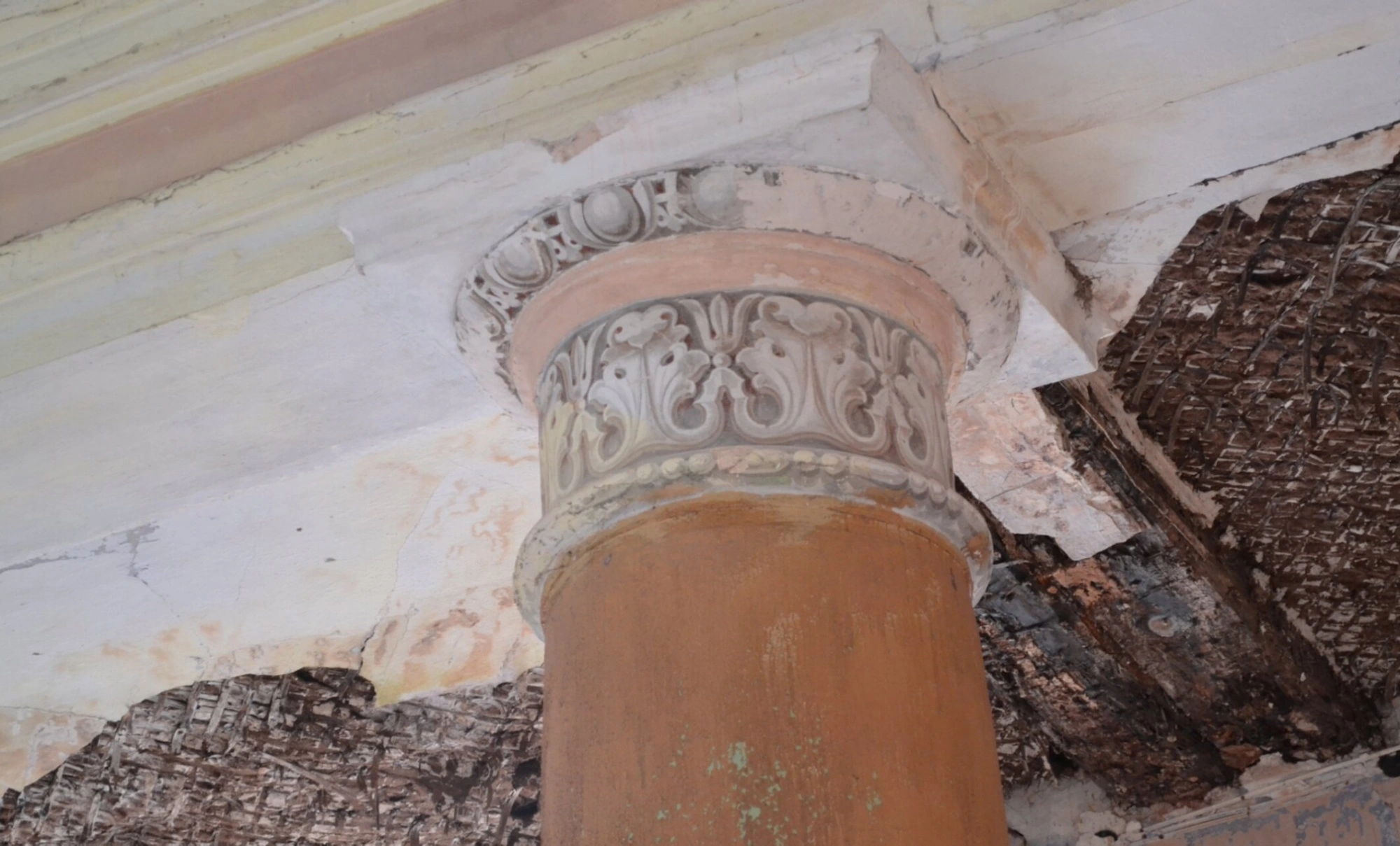 На фотографии запечатлён фрагмент интерьера Богоявленской церкви, расположенной в деревне Яконово Тверской области. Храм освящён в честь Богоявления Господня и представляет собой значительный памятник православной архитектуры, ныне пребывающий в заброшенном состоянии. В центре композиции изображена массивная колонна, поддерживающая своды храма. Ствол колонны покрыт слоем охристой краски, которая местами облупилась, обнажая историческую штукатурку. Капитель колонны украшена изысканной лепниной, включающей стилизованные растительные орнаменты и волюты, что характерно для традиционного церковного зодчества. Над колонной видны фрагменты перекрытия с осыпающейся штукатуркой, сквозь которую проступают деревянные балки и дранка. Трещины на стенах и потолке, а также многочисленные следы влаги свидетельствуют о длительном отсутствии ремонта и реставрации. Несмотря на запустение, интерьер сохраняет величие и духовную атмосферу, напоминая о былом значении храма как центра православной жизни в округе. Богоявленская церковь в Яконово является частью культурного наследия России и требует внимания со стороны общества и государства для сохранения уникальной архитектуры и памяти о вере предков.