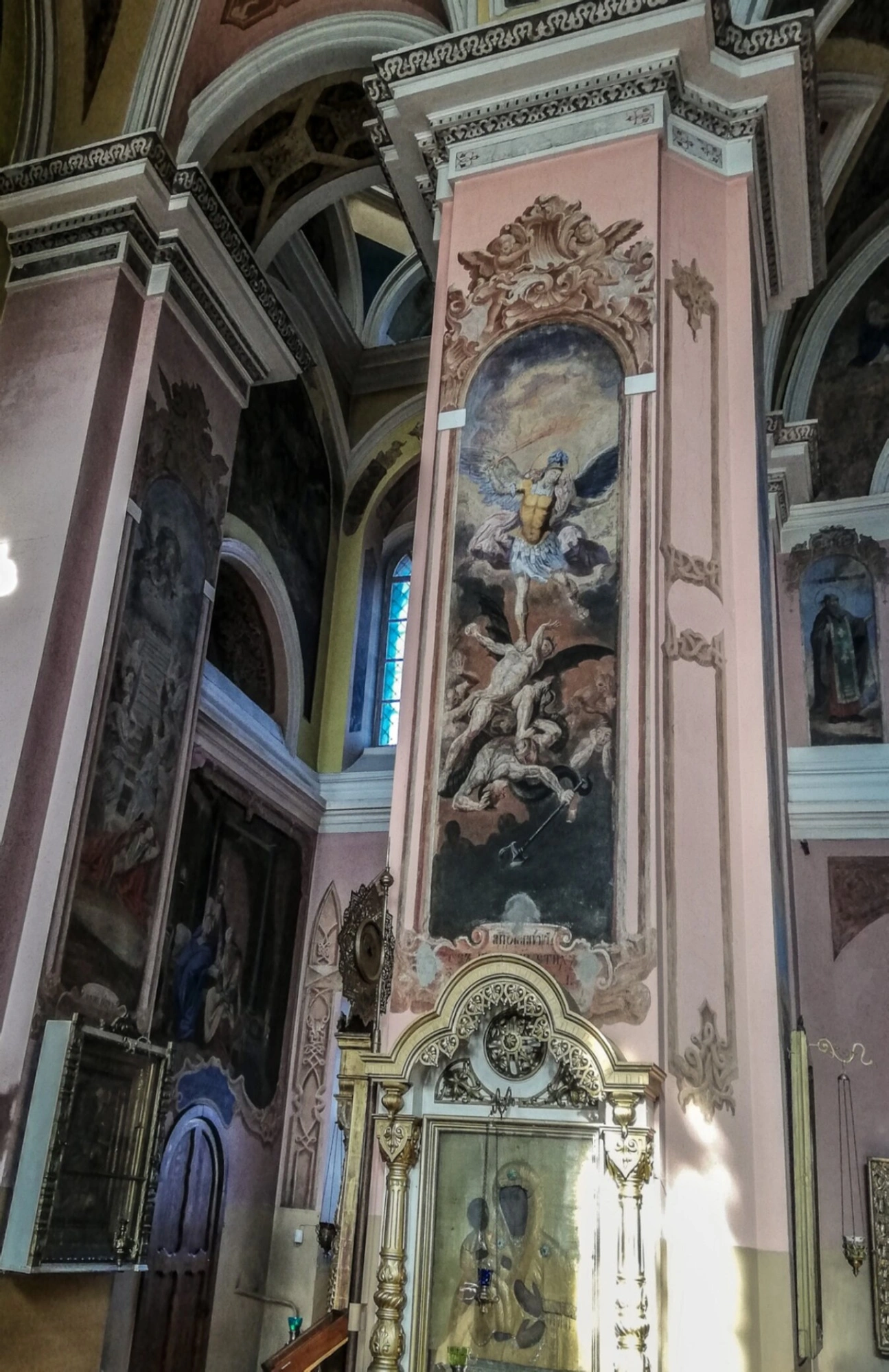 В центре композиции фотографии dominates мощная колонна, украшенная монументальной фреской, изображающей сцену низвержения с небес падших ангелов. Это классическая иконография, посвящённая Небесному Воеводе — Архангелу Михаилу, который почитается как главный защитник верующих и победитель сил тьмы. Росписи храма, выполненные в традиционной манере, поражают своей динамикой и духовной силой, напоминая молящимся о вечной борьбе добра со злом.