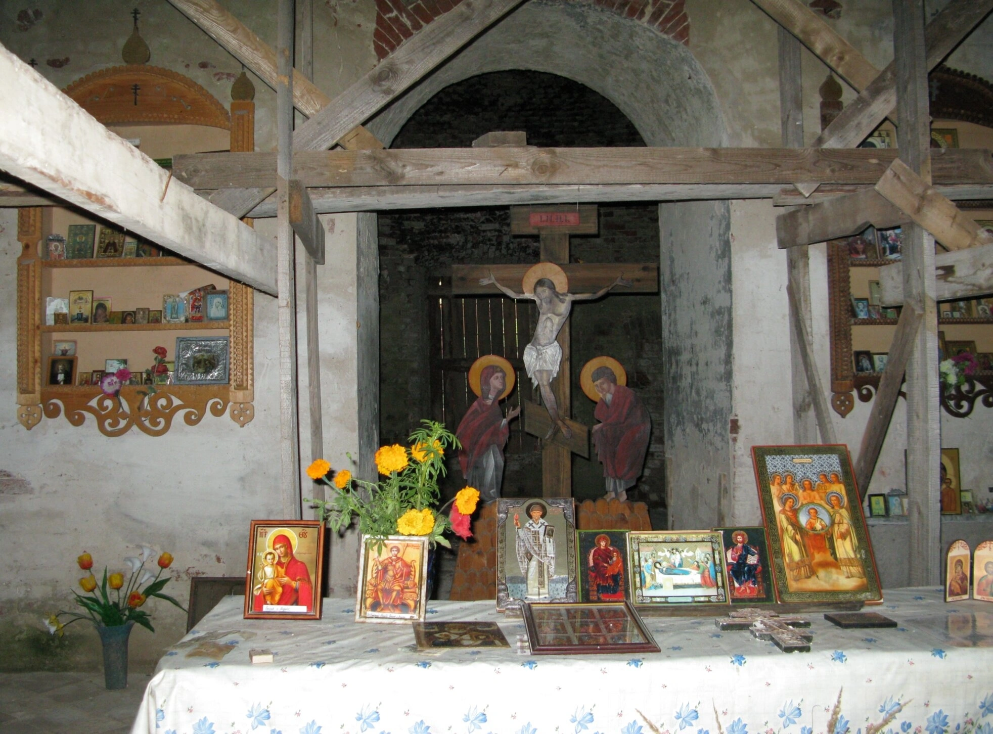 В центре композиции вниманию предстаёт импровизированный алтарь, устроенный на простом столе, покрытом белой тканью с цветочным орнаментом. Подобное расположение престола свидетельствует о попытках сохранения молитвенного назначения храмового пространства даже в годы запустения.