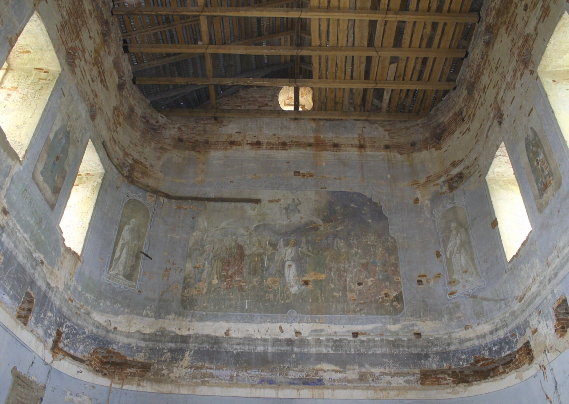 Свод храма открывает взору деревянные конструкции крыши - балки и стропила, составляющие каркас кровли. Часть перекрытий отсутствует, благодаря чему в помещение проникает естественное освещение. Высокие арочные оконные проёмы без оконных заполнений также пропускают дневной свет, создавая особую атмосферу в пространстве заброшенного храма.