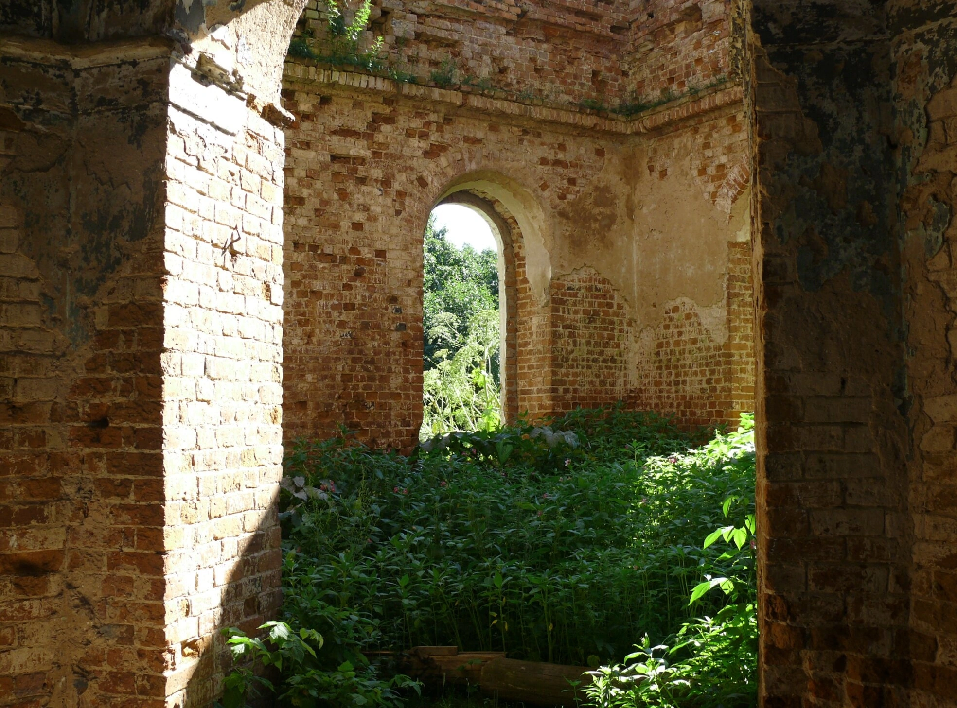 На представленной фотографии запечатлен интерьер некогда величественного храма - Церкви Введения во храм Пресвятой Богородицы с приделом великомученицы Екатерины, расположенной на Бронницкой горе в Новгородской области. Святыня, возведенная в XVIII веке, ныне пребывает в состоянии благоговейного запустения, где природа постепенно возвращает себе некогда освященное пространство.