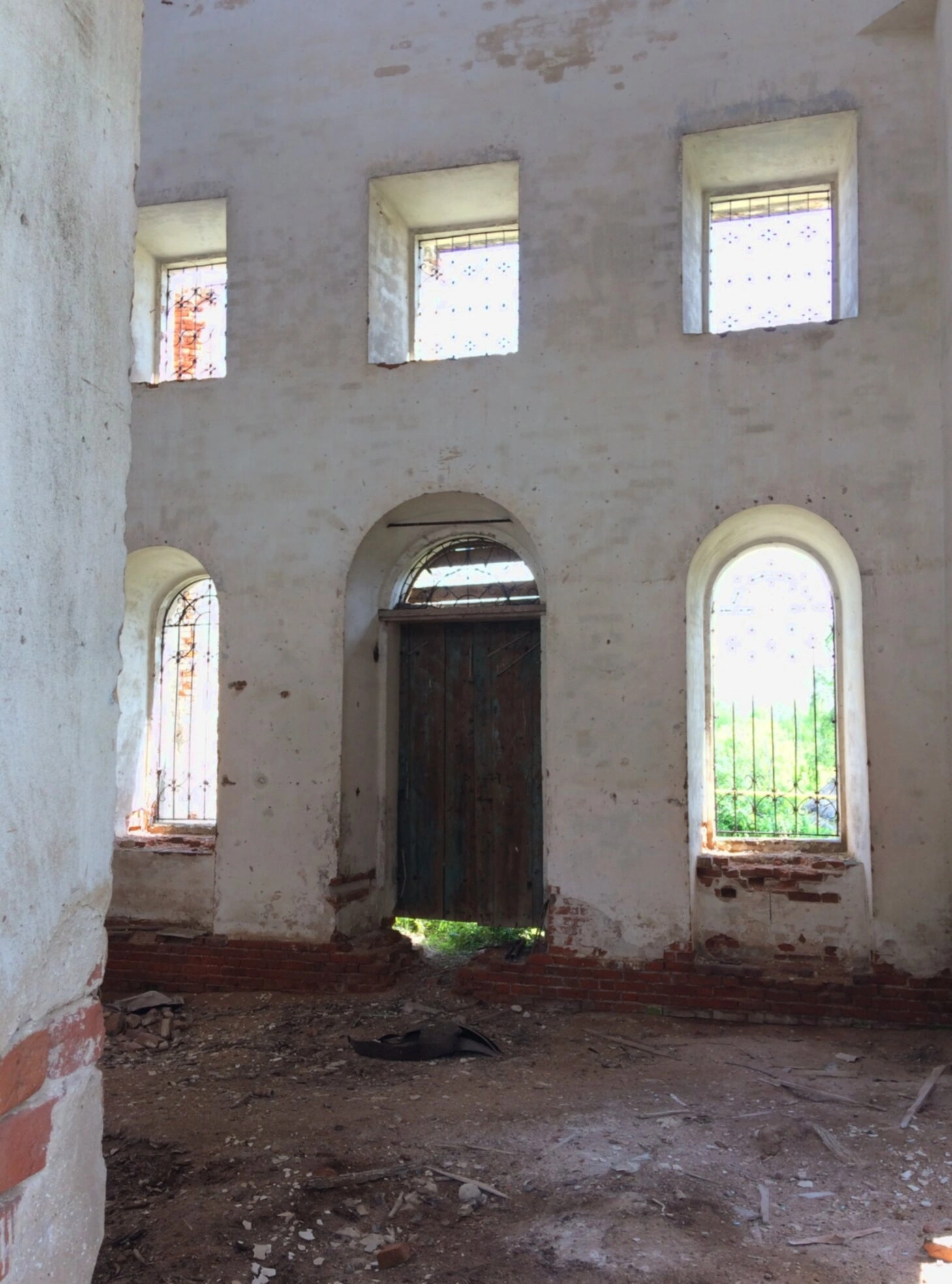 Центральным элементом композиции служит высокий арочный дверной проём, в котором установлена массивная деревянная дверь, ведущая в соседнее церковное помещение или наружу. Пол храма покрыт слоем мусора и строительных обломков, что свидетельствует о периоде запустения или ведущихся реставрационных работах. Несмотря на следы разрухи, в архитектурных деталях угадывается былое благолепие этого дома Божьего, призывающего к молитве и напоминающего о вечности.