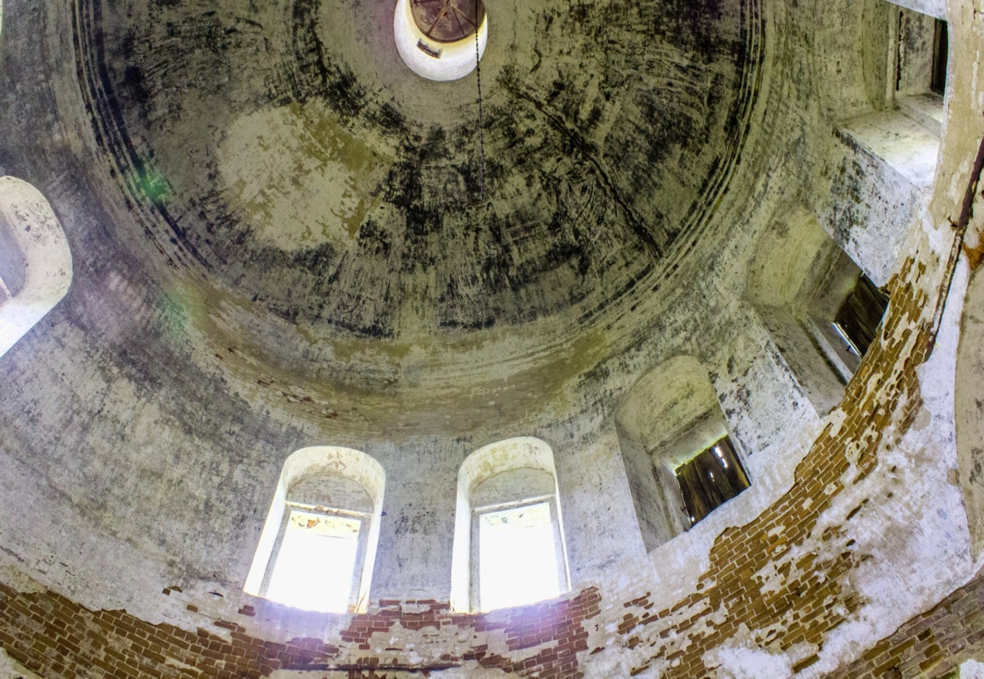 Купол храма, имеющий классическую округлую форму, демонстрирует следы времени: поверхность испещрена трещинами, фрагменты штукатурки отслоились, обнажая кирпичную кладку. В центре купола расположено отверстие, через которое проникают потоки естественного света, создавая в интерьере особую атмосферу духовности. По периметру основания купола размещены арочные оконные проемы, через которые в помещение проникают лучи дневного света, контрастирующие с затемненными участками стен.