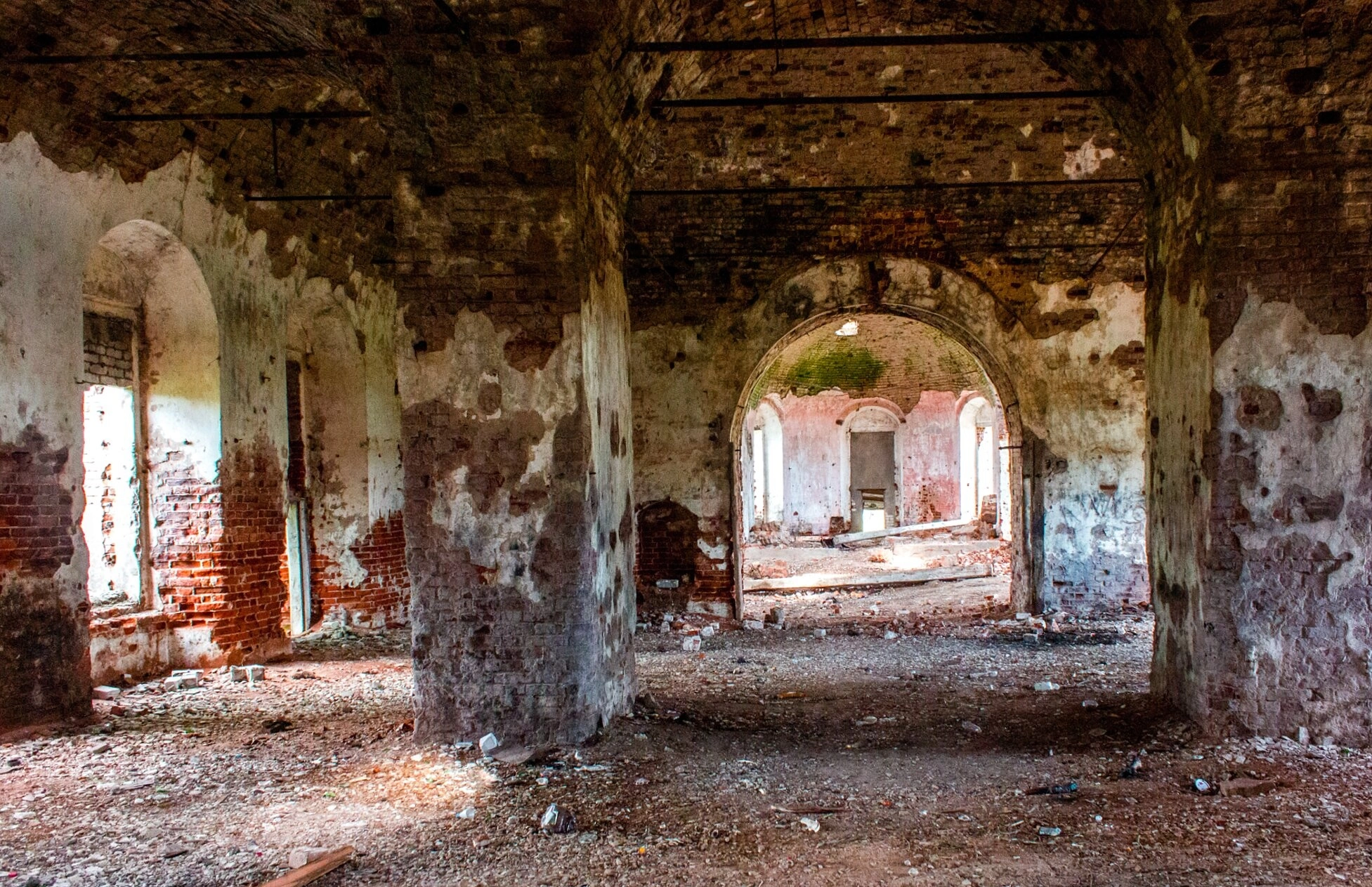 Внутреннее пространство храма поражает сочетанием разрухи и уцелевших элементов церковной архитектуры. Монументальные кирпичные стены, частично утратившие штукатурное покрытие, прорезаны арочными проёмами, ведущими в другие помещения церковного здания. Сводчатые конструкции и арки, характерные для православного храмостроительства, несмотря на повреждения, продолжают поддерживать архитектурную композицию.