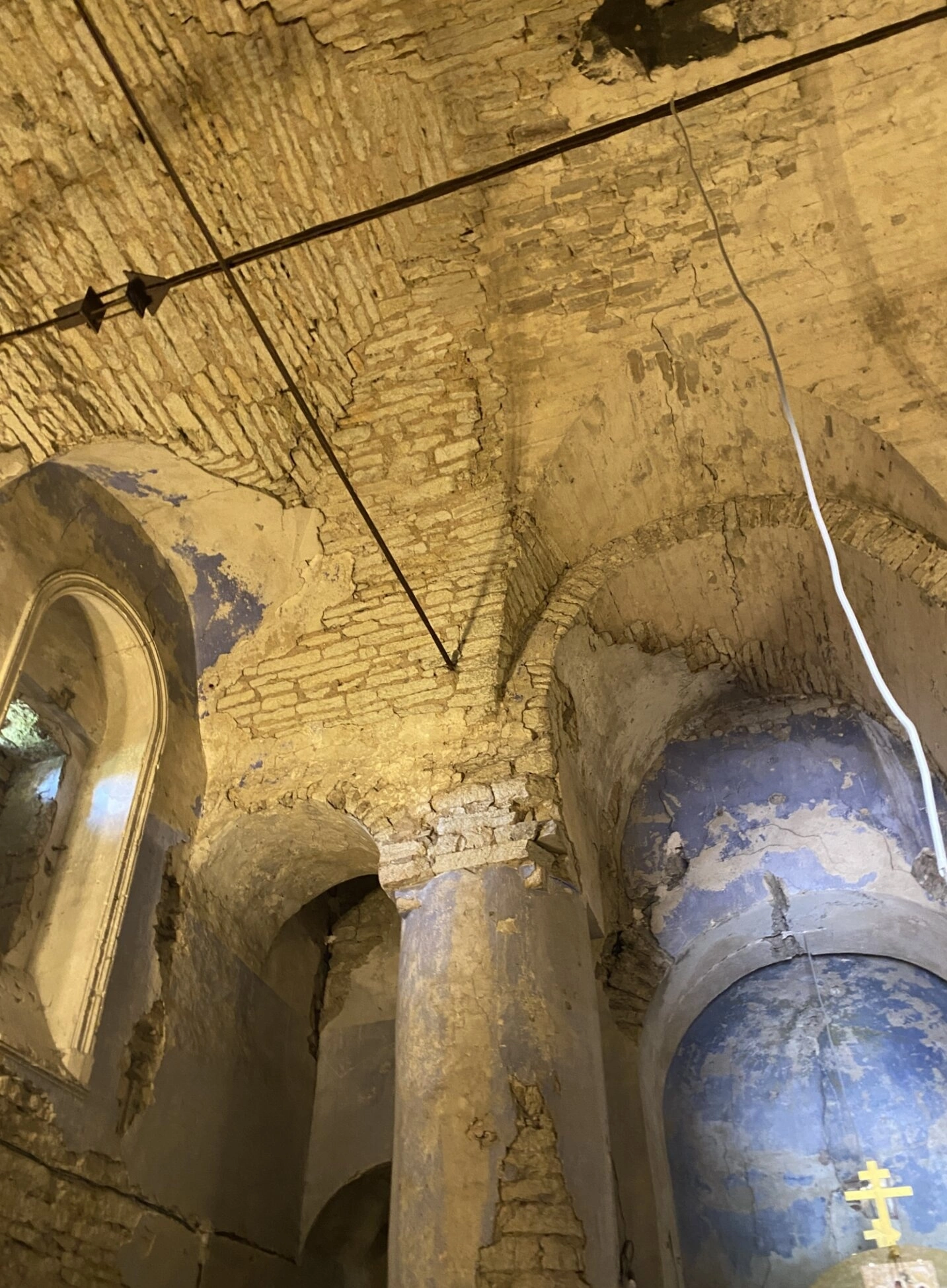 Присутствующие на снимке металлические конструкции являются частью системы освещения или укрепления исторической постройки, позволяющей и ныне совершать в стенах храма богослужения. Вся атмосфера интерьера дышит благодатной стариной и духовной силой, присущей древним псковским церквям, хранящим память о великой истории Православия на Руси.