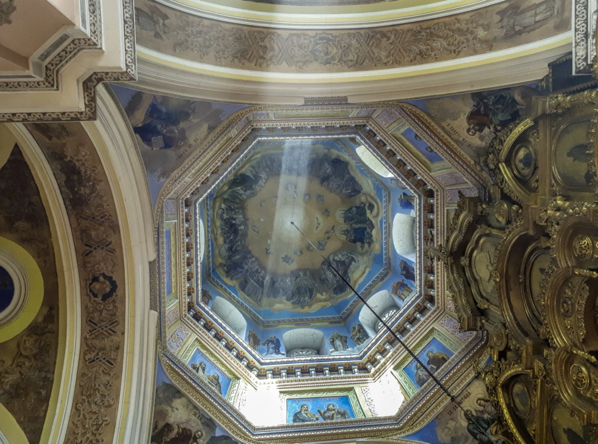 Центральным элементом композиции является восьмигранный купол, богато украшенный монументальной росписью. На фресках изображены лики святых и сцены из Священного Писания, выполненные в традициях православной иконографии. Сквозь центральное отверстие купола, символизирующее небесный свод, проникают лучи божественного света, нисходящие вниз и озаряющие молящихся. Этот эффект создаёт ощущение присутствия Благодати Божией и подчёркивает духовную значимость места.