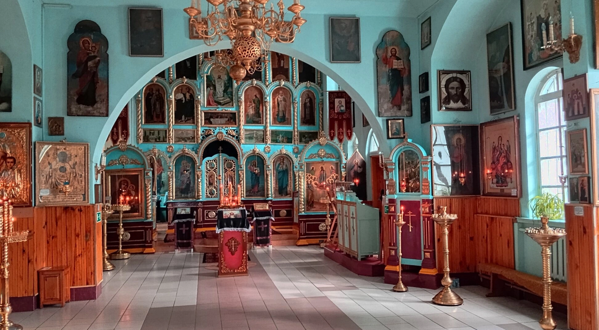 Взгляд устремляется на мощные колонны, поддерживающие своды храма, и на богато украшенный многоярусный иконостас, который является смысловым и духовным центром любого православного храма. Присутствующие в интерьере подсвечники, церковная утварь и иконы создают атмосферу благоговения и молитвенного сосредоточения. Свет, проникающий внутрь, озаряет пространство, подчёркивая величие и красоту дома Божия.