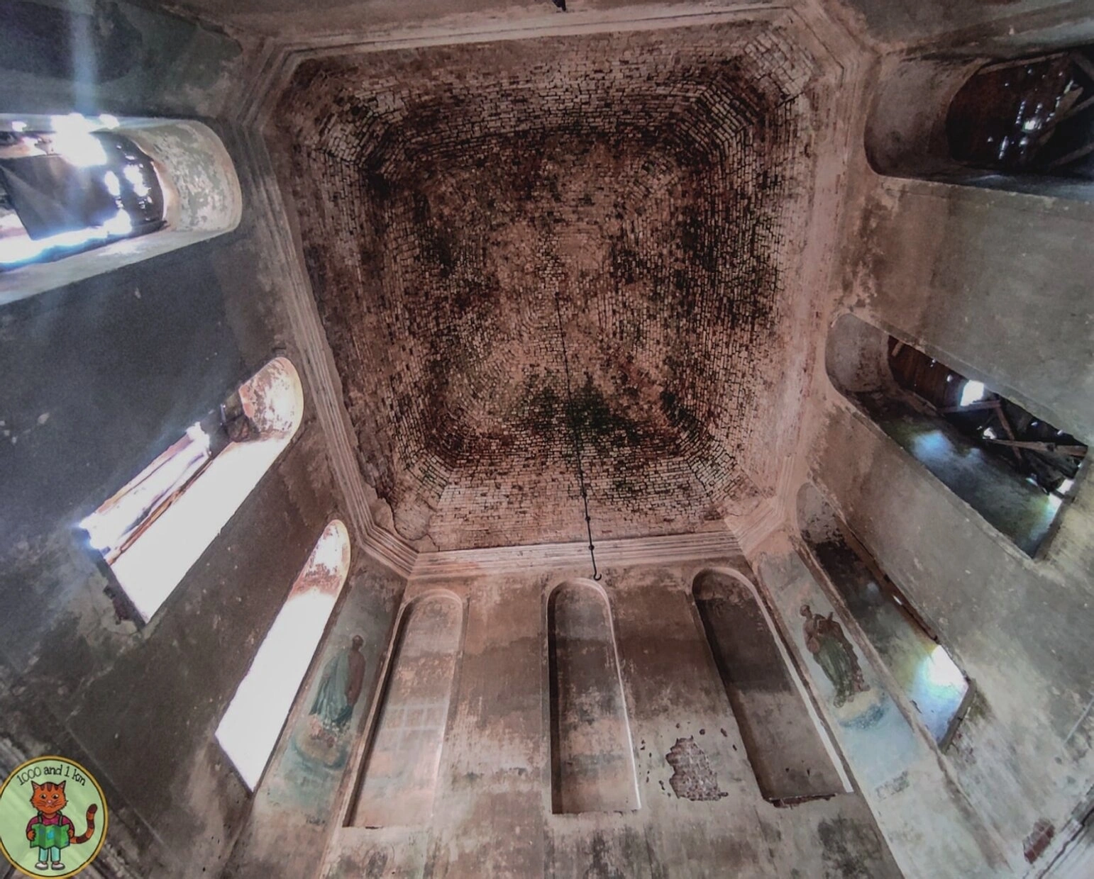 Храм представляет собой образец русской православной архитектуры, характерной для сельских церквей центральной России. На фотографии видны элементы внутреннего убранства: сводчатые потолки, оконные проемы, некогда украшенные витражами, и остатки церковной росписи на стенах. Особое внимание привлекает игра света и тени, создающая атмосферу благоговейной тишины и вечности.