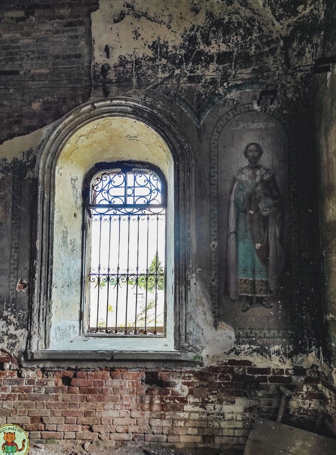 В центральной части кадра находится арочное окно, украшенное кованой решеткой. Через него в пространство храма проникает дневной свет, символически напоминая о Божественном свете, освещающем путь верующим. Справа от окна на стене сохранилась поврежденная фреска с изображением святого, почитаемого в православной традиции.