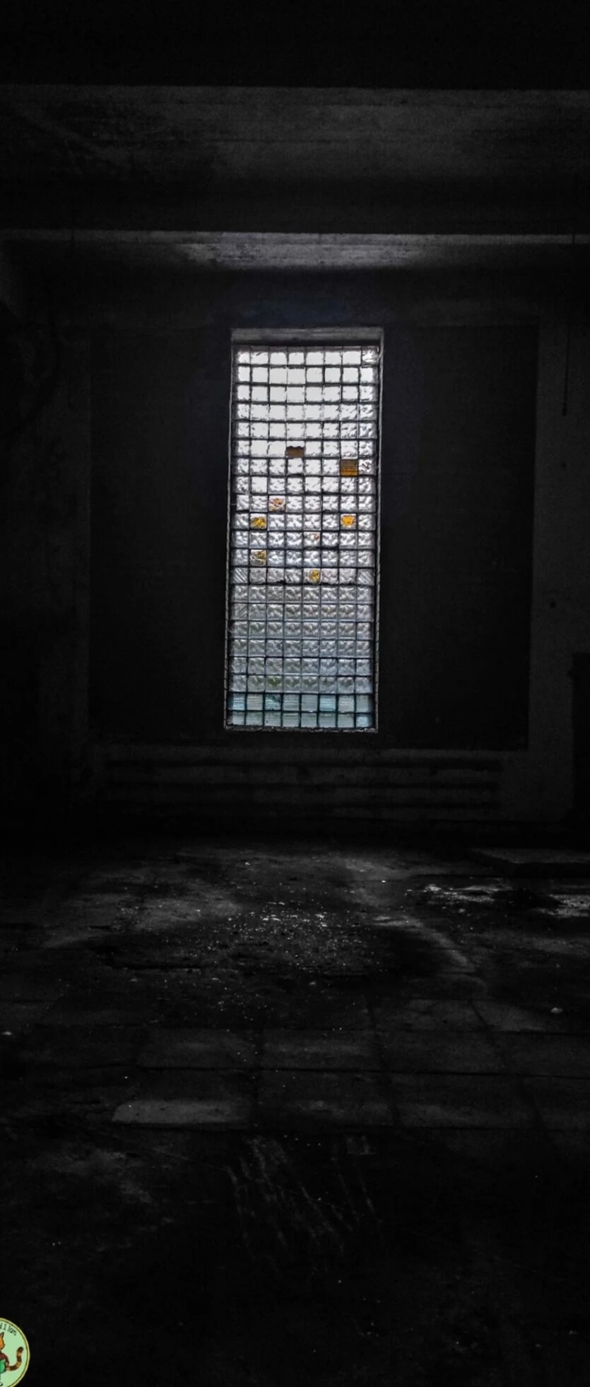 В центральной части композиции выделяется высокое узкое окно, характерное для православной храмовой архитектуры. Оконный проём состоит из множества квадратных стеклянных блоков, часть которых повреждена, что свидетельствует о длительном отсутствии реставрационных работ. Через сохранившиеся стёкла проникает тусклый дневной свет, который освещает пыльное каменное покрытие пола и создаёт выразительный контраст с тёмными поверхностями стен и сводчатого потолка.