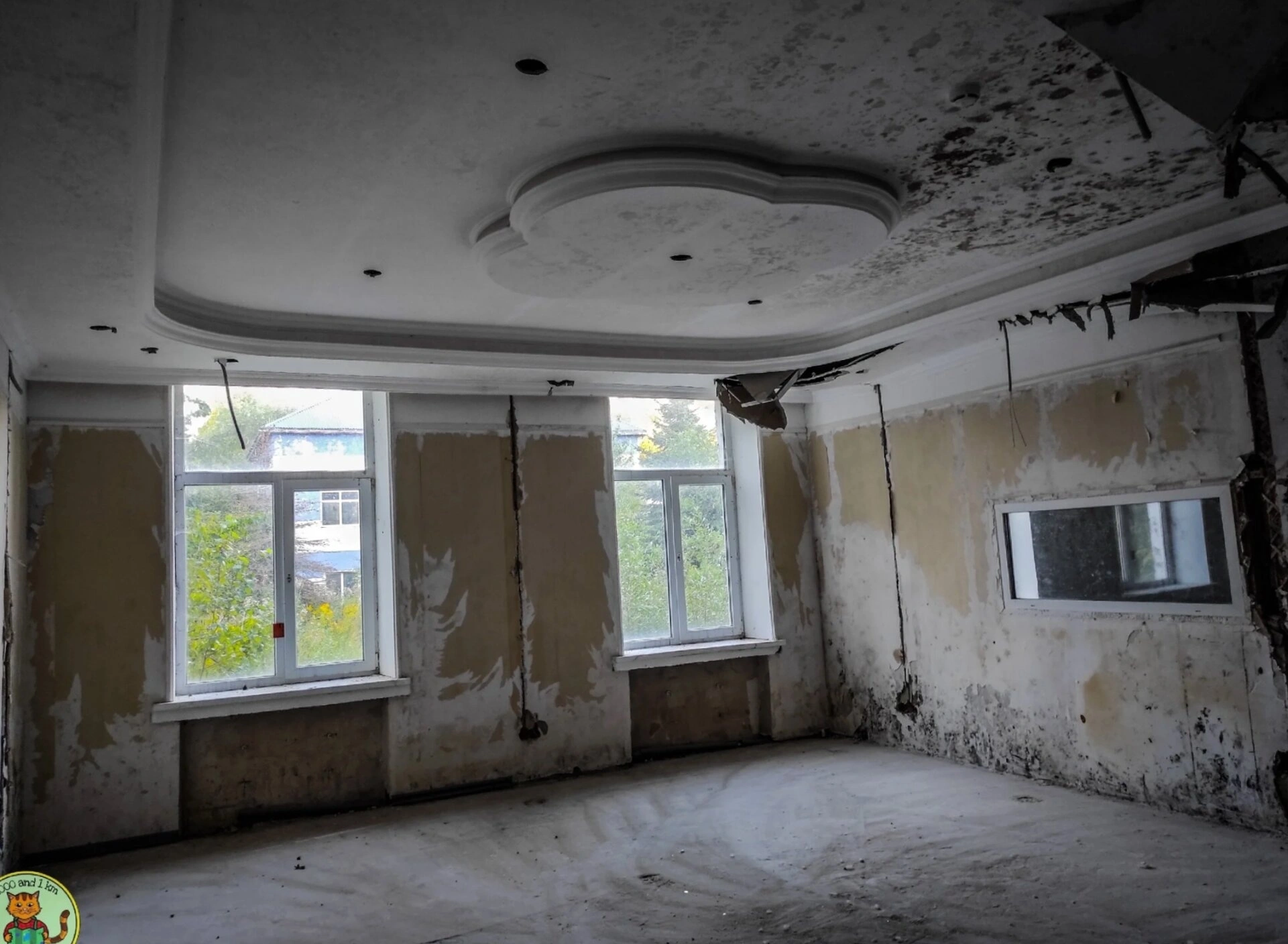 Помещение храма демонстрирует следы многолетнего neglect. Стены частично лишились штукатурного покрытия, обнажив кирпичную кладку. На поверхности стен явственно видны повреждения от проникновения влаги, распространения плесневого грибка, особенно в нижних секциях. Электропроводка беспорядочно свисает со стен и потолочных перекрытий.