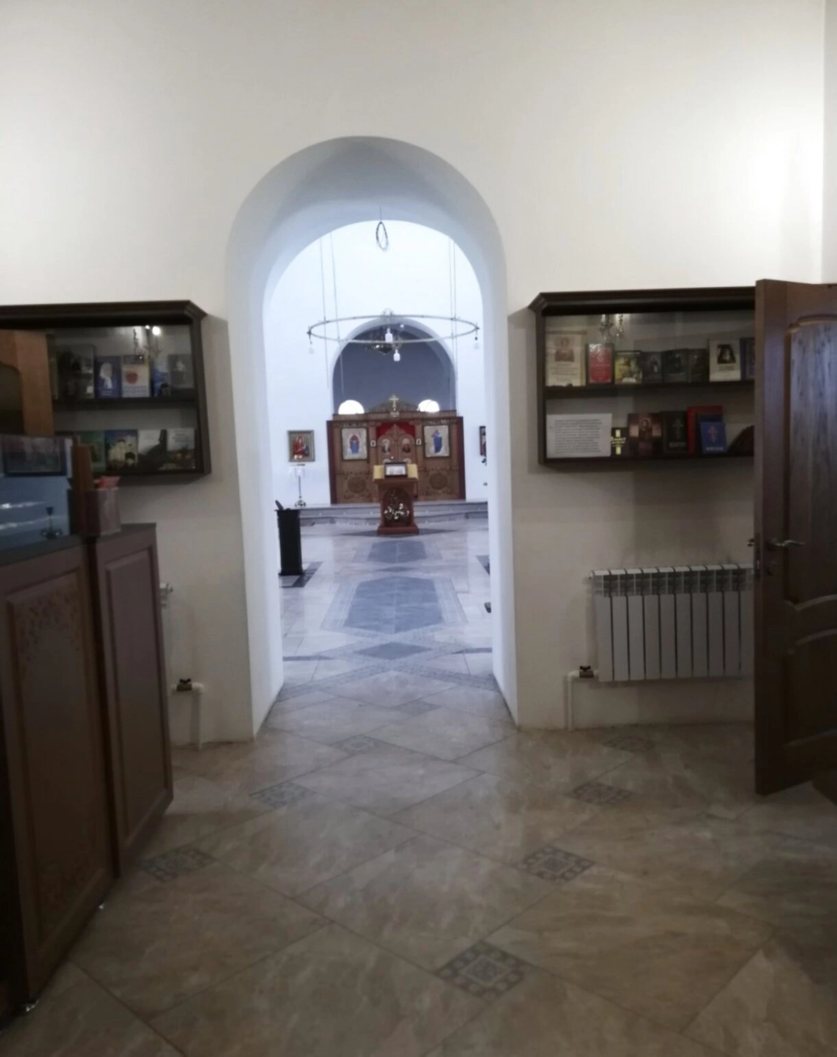 На переднем плане отчетливо виден центральный проход, выложенный кафельной плиткой, который ведет к главному пространству храма. Этот путь символически устремляет взор верующих toward алтарной части, где совершается главное церковное таинство - Евхаристия.