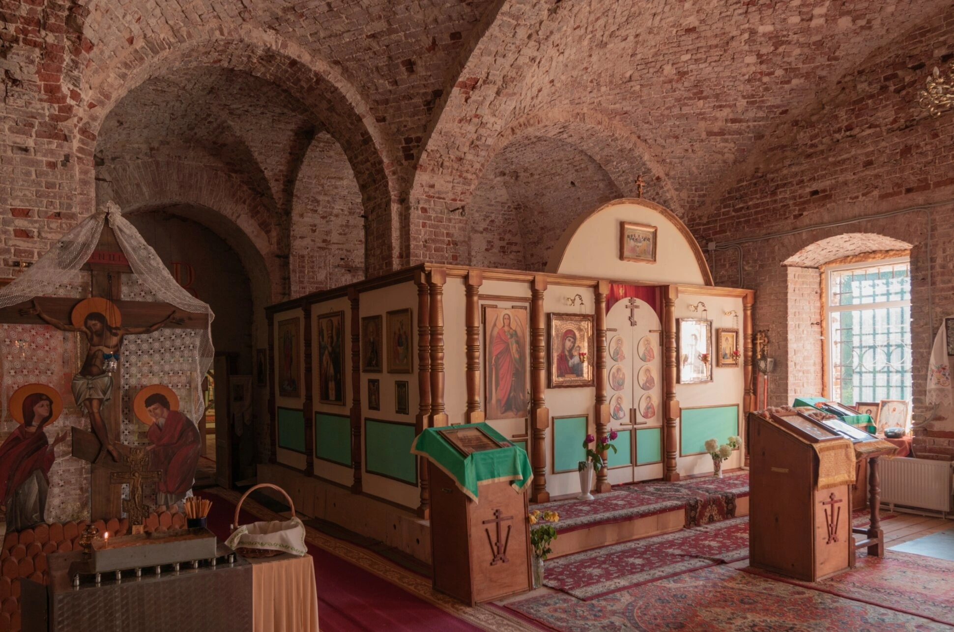 Архитектурные особенности интерьера подчёркивают аскетичный характер помещения. Стены и своды выполнены из кирпичной кладки без штукатурки, что создаёт особую атмосферу духовной сосредоточенности. Арочные своды, характерные для церковной архитектуры, придают пространству величие и гармоничность.