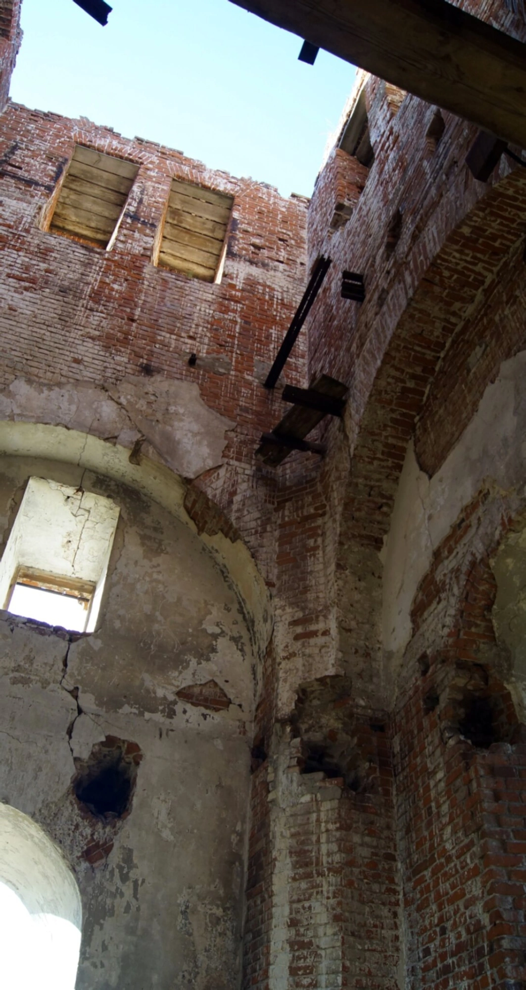 На фотографии запечатлён скорбный вид интерьера Церкви Покрова Пресвятой Богородицы, расположенной в селе Красная Река Старомайнского района Ульяновской области. Снимок, сделанный снизу вверх, открывает взору величественные арочные своды, сложенные из красного кирпича, и остатки штукатурки на стенах. Сквозь частично обрушившиеся перекрытия, где видны несущие деревянные балки, проникает дневной свет, освещая пространство, некогда наполненное молитвами, а ныне пребывающее в запустении. Оконные проёмы, некоторые из которых заколочены досками, напоминают о попытках сохранить то, что ещё осталось.