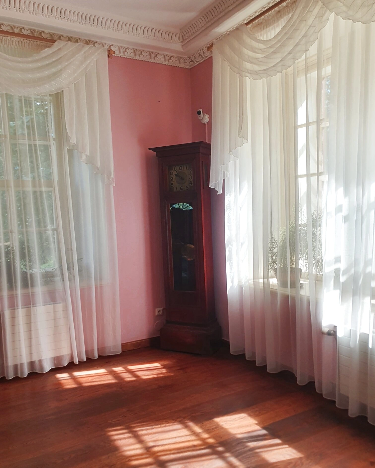 На снимке изображён угол храмового помещения с двумя большими оконными проёмами, через которые в священное пространство проникает божественный свет. Стены помещения окрашены в бледно-розовые тона, создающие атмосферу духовного тепла и умиротворения. Потолок украшен изящной лепниной, что свидетельствует о внимании к деталям в убранстве дома Божьего.