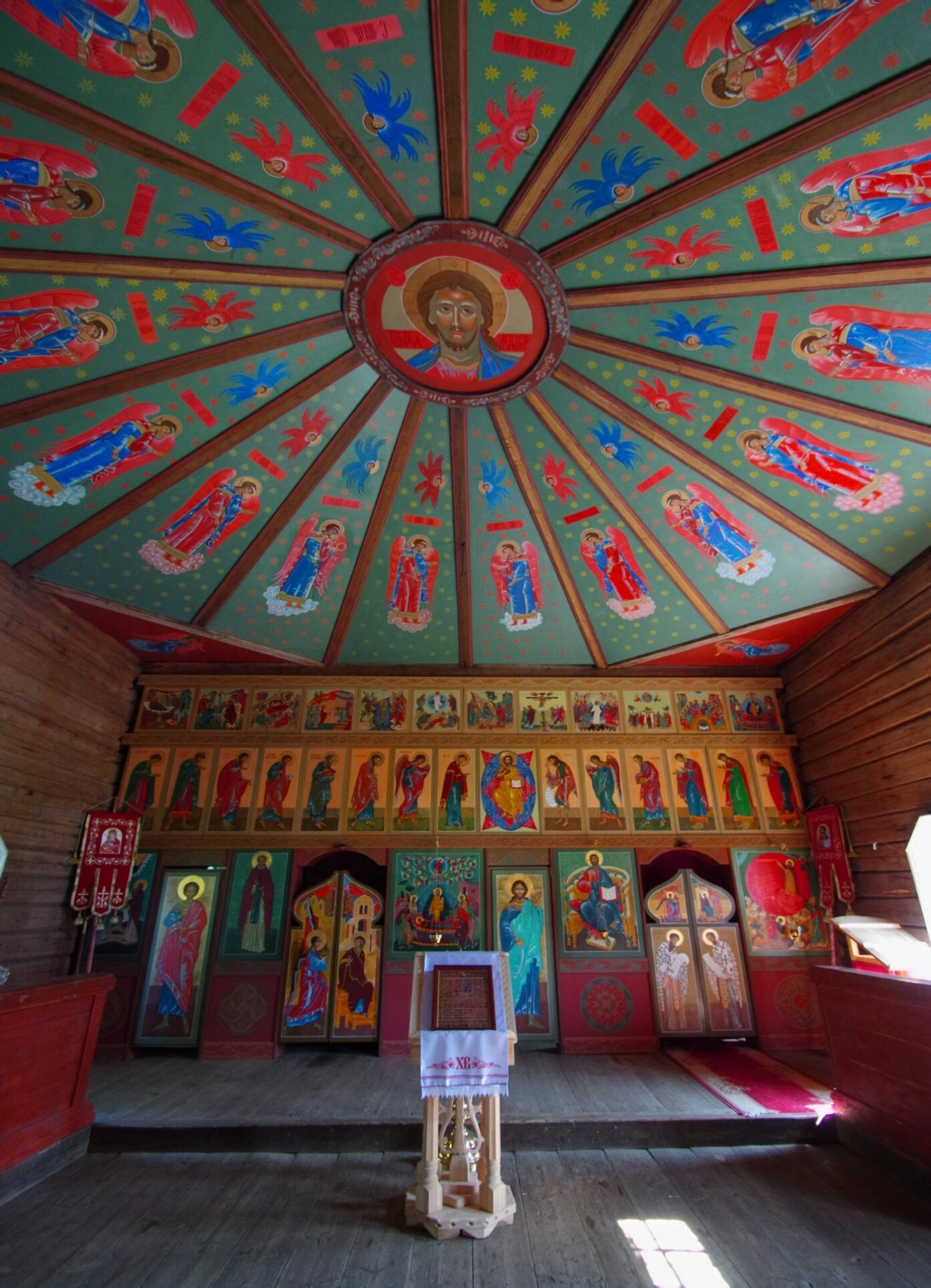 На представленной фотографии запечатлён благодатный интерьер древнего храма во имя святого славного Пророка Божия Илии, что расположен на территории Ильинского погоста в Водлозерье. Этот уникальный памятник деревянного зодчества, возведённый в XVII веке, является духовным центром Водлозерского национального парка, имеющего статус биосферного резервата ЮНЕСКО.