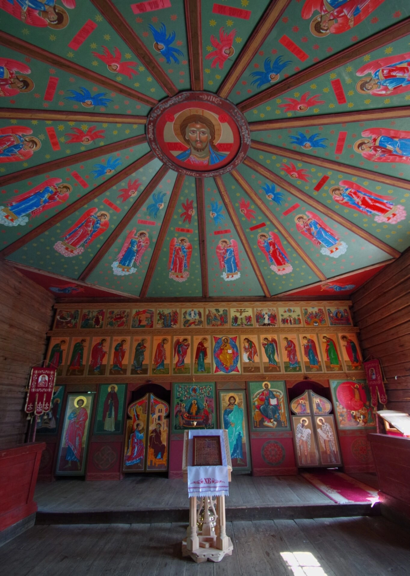 На фотографии запечатлён интерьер действующего храма в честь святого пророка Илии, расположенного на Ильинском Водлозерском погосте. Этот уникальный памятник федерального значения, находящийся на острове Малый Колгостров в пределах Водлозерского национального парка, был возведён тщанием прихожан в 1798 году на месте обветшавшей шатровой церкви. Четвёртая по счёту церковь на этом месте была построена местными плотниками и ныне является частью мужского монастыря — Свято-Ильинской Водлозерской пустыни.