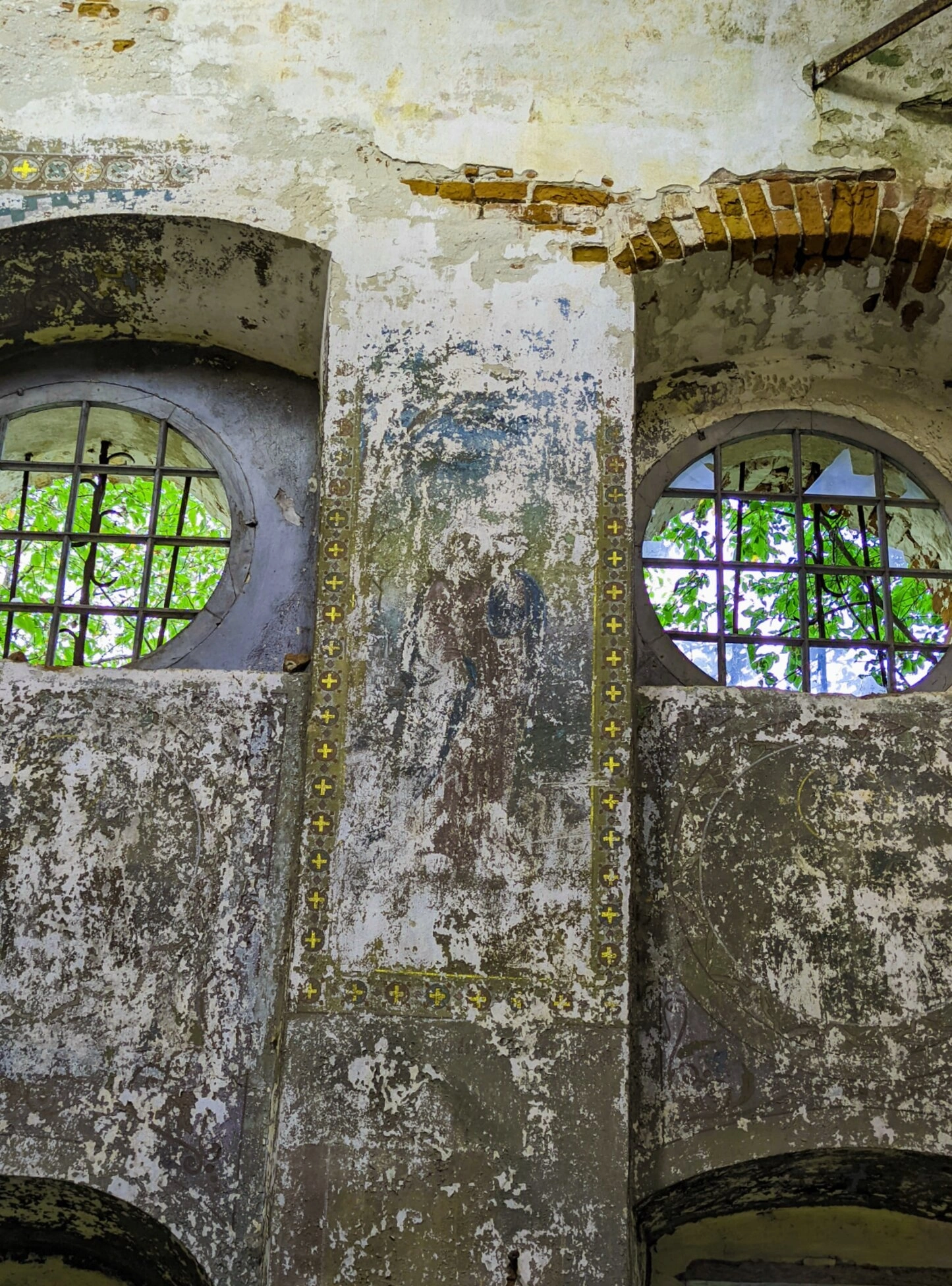 Особого внимания заслуживает участок стены между оконными проёмами, где сохранились фрагменты древней храмовой росписи. На осыпающемся грунте угадываются вертикальные композиции, возможно, представляющие собой изображения святых или орнаментальные элементы, характерные для православной иконографии. К сожалению, значительная часть штукатурного слоя утрачена, обнажив кирпичную кладку, что свидетельствует о многолетнем отсутствии должного попечения о доме Божием.