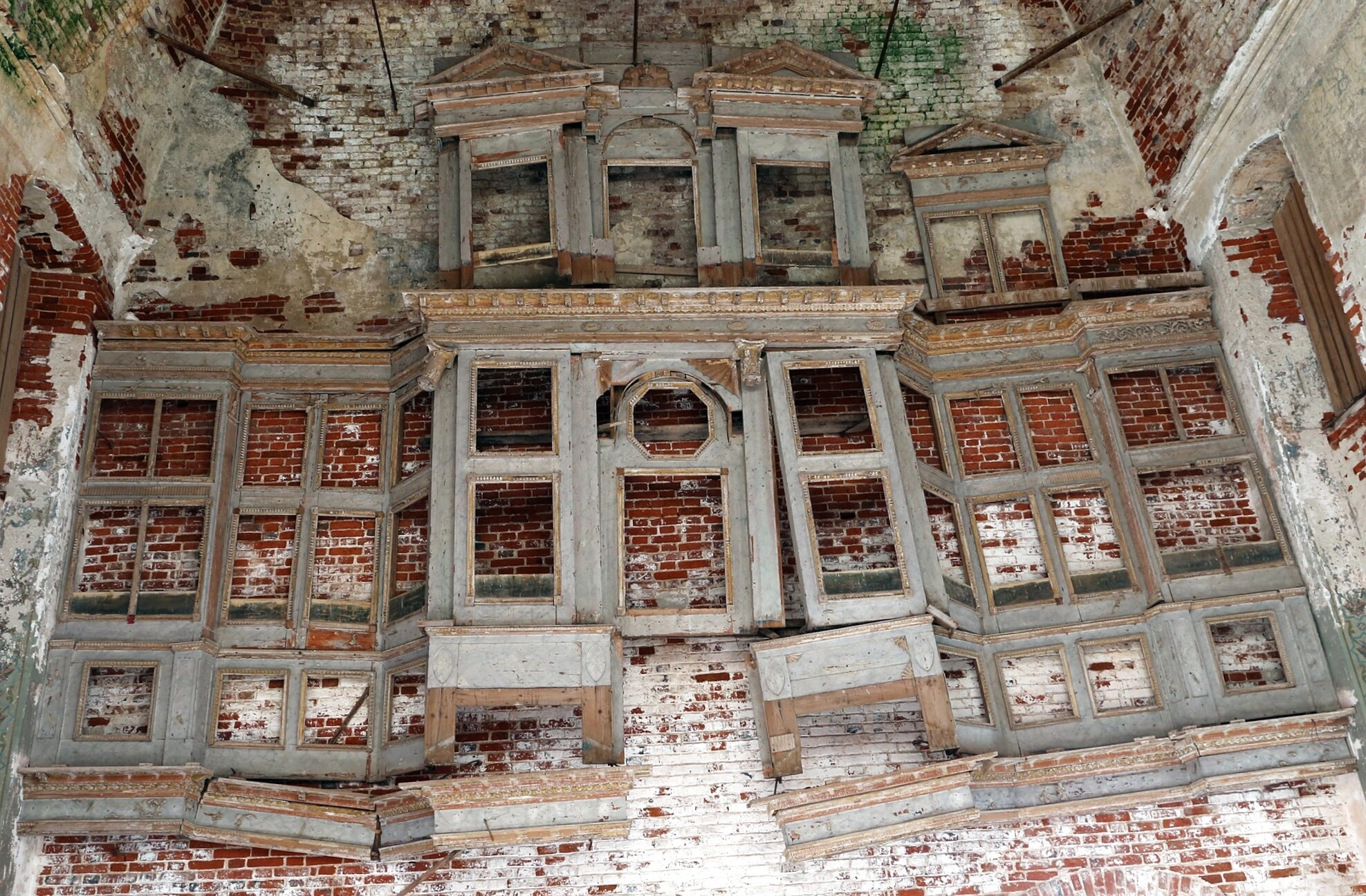 В центре композиции изображен многоярусный деревянный иконостас, который в православной традиции символизирует границу между миром земным и горним. Некогда украшенный позолотой и резьбой, ныне он представляет собой печальное зрелище: конструкция сильно повреждена, элементы декора обвалились, а сохранившиеся фрагменты покрыты слоями облупившейся краски голубовато-серого оттенка. Сквозь пустые проемы, где ранее располагались святые образа, проступает кирпичная кладка алтарной стены.
