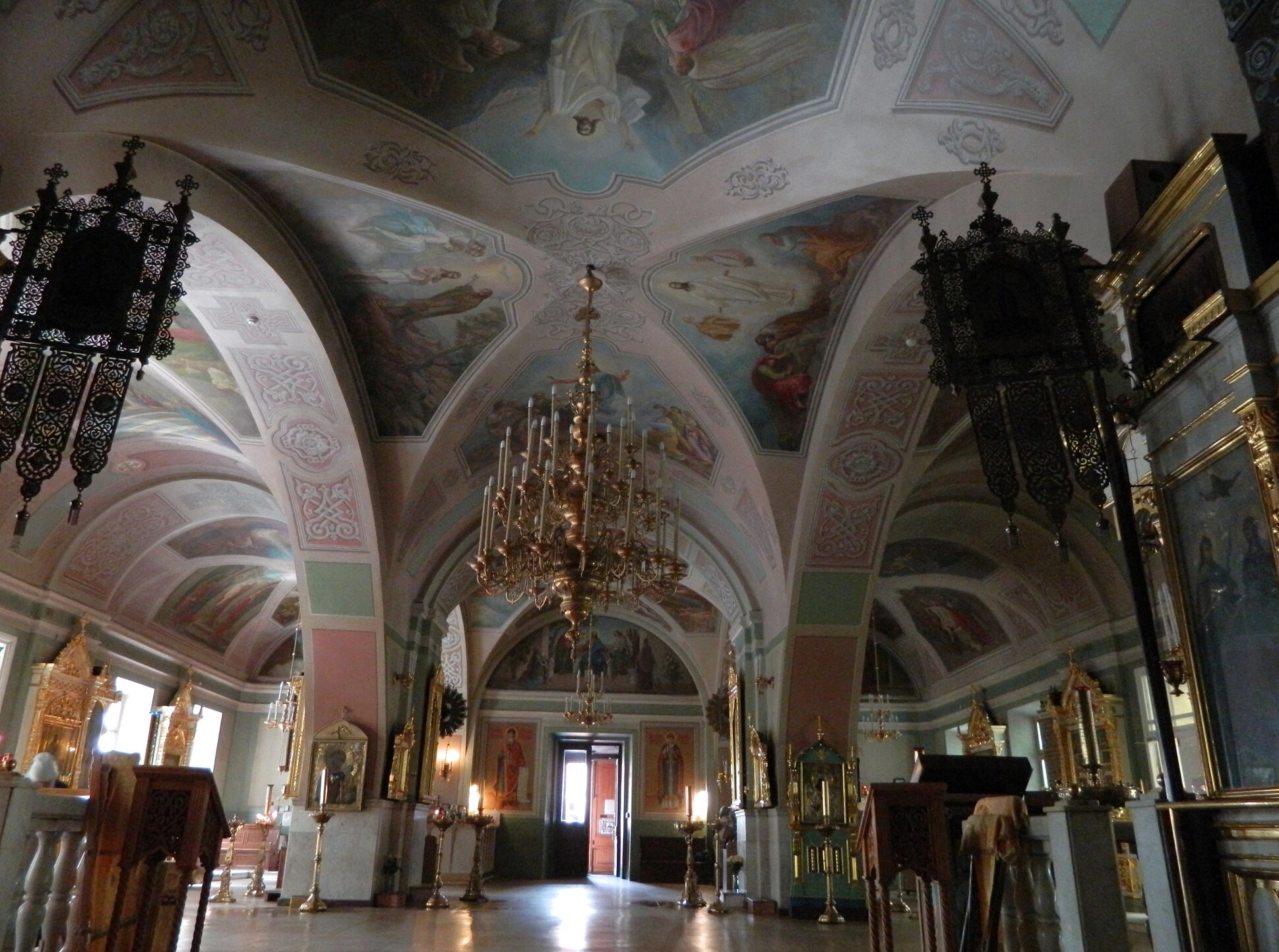 В центре композиции находится просторный высокий зал, увенчанный сводчатыми потолками, которые богато украшены настенными росписями и фресками на библейские сюжеты. Многочисленные арки, поддерживающие своды, придают внутреннему пространству особую монументальность и торжественность. Основным источником света является большая центральная люстра, выполненная в традиционном церковном стиле, которая дополняется настенными светильниками, создающими мягкое и благоговейное освещение.