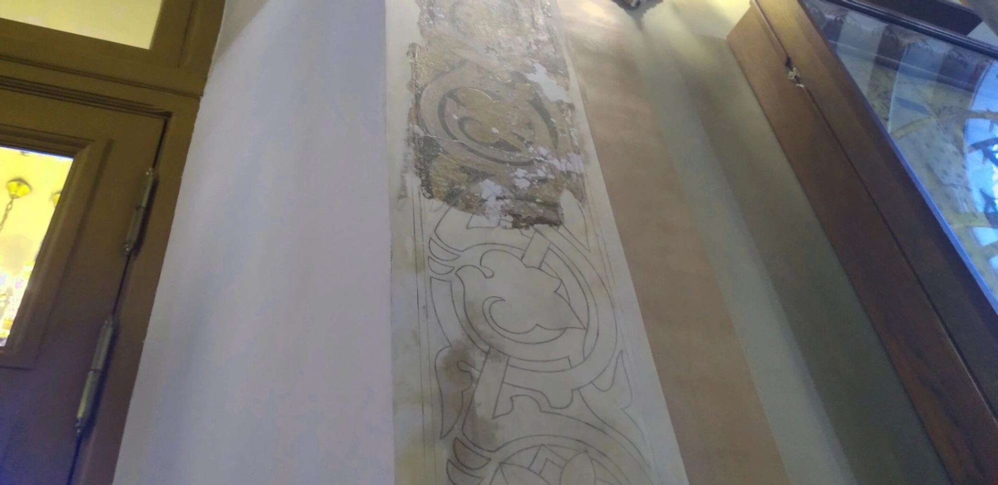 На представленном изображении запечатлен фрагмент священного пространства Церкви Рождества честного славного Пророка, Предтечи и Крестителя Господня Иоанна, что расположена на Каменном острове в граде Санкт-Петербурге. Внимание сосредоточено на участке церковной стены, где явственно просматриваются следы проводимых реставрационных работ либо незавершенной настенной росписи.