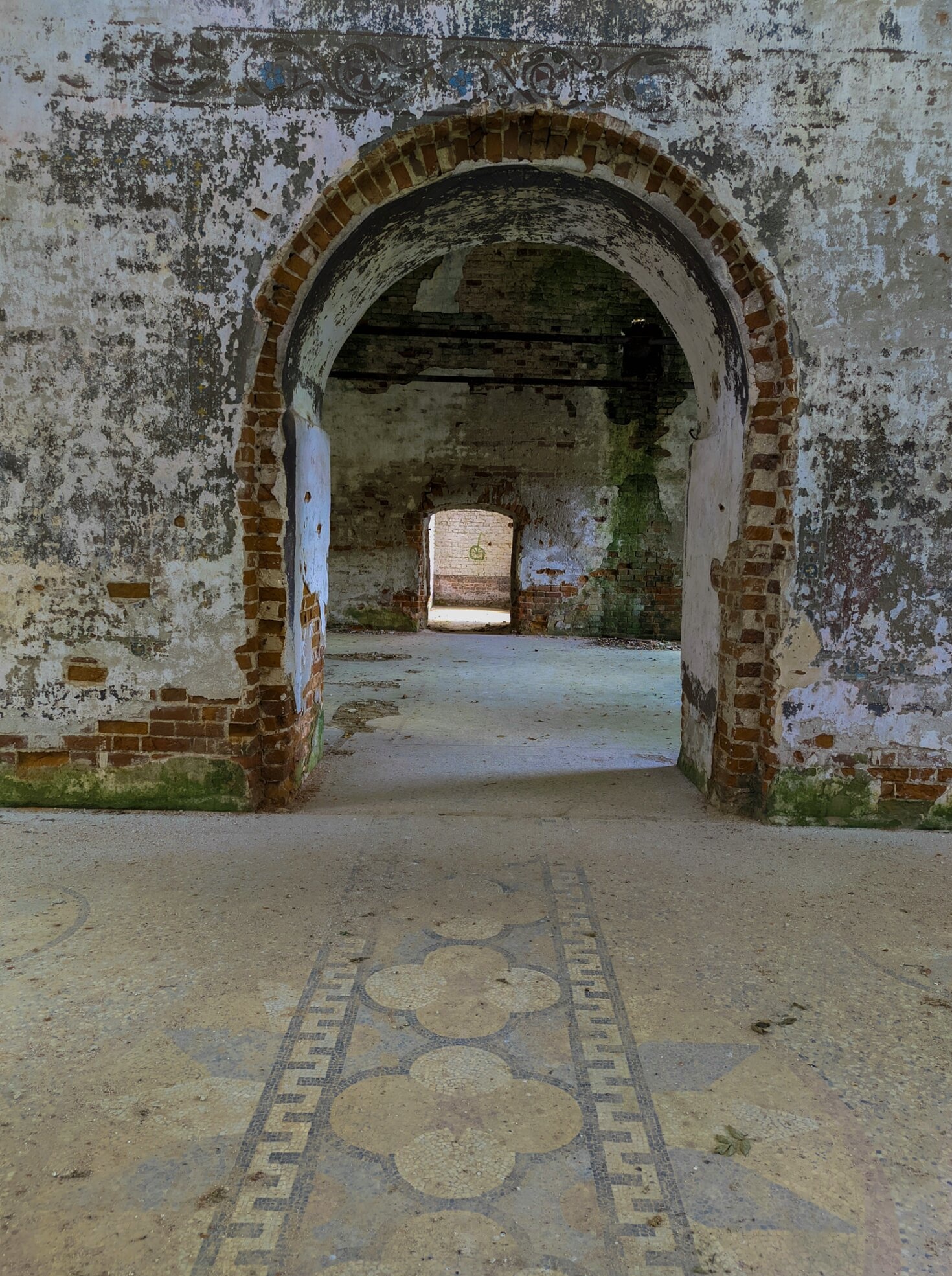 Особого внимания заслуживает сохранившийся элемент храмового убранства - мозаичная дорожка, вмурованная в цементный пол. Геометрический узор из плиток светлых и темных оттенков, хотя и потертый временем, все еще просматривается, напоминая о художественном замысле создателей этого священного пространства. В глубине композиции виднеется узкий дверной проем, ведущий в дальнейшие помещения храма, что создает ощущение таинственности и глубины.