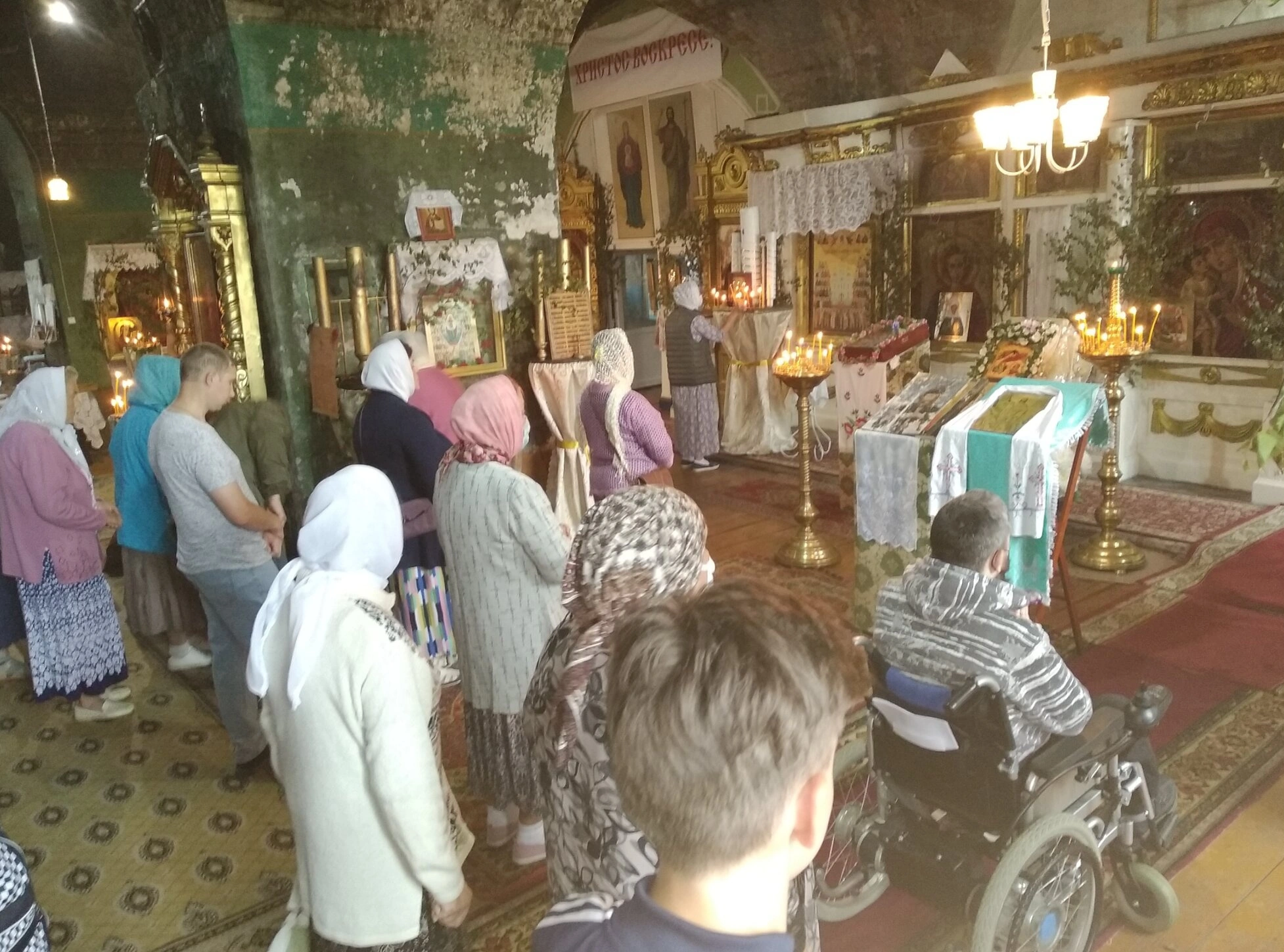 Внутреннее пространство церкви отличается благоговейной атмосферой молитвенного собрания. В храме присутствуют прихожане, преимущественно женщины, которые стоят, обратившись лицом к святому алтарю. Среди молящихся находится человек в инвалидной коляске, что свидетельствует о доступности храма для всех верующих.