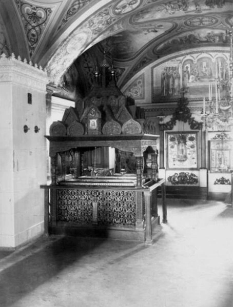 На представленной фотографии запечатлён интерьер храма Рождества Пресвятой Богородицы, расположенного в исторической местности Старое Симоново в Москве. Храм обладает особой духовной значимостью, поскольку на его территории погребены герои Куликовской битвы – иноки-воины Александр Пересвет и Родион Ослябя.