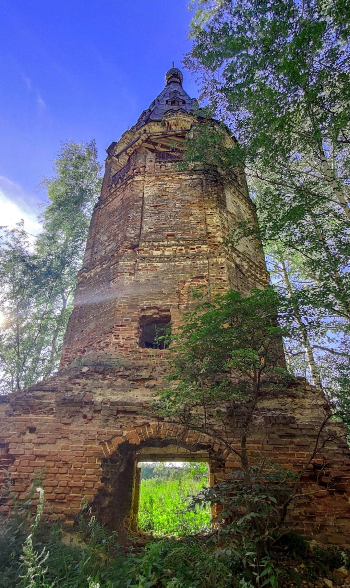 Взору открывается величественный сводчатый купол, пронизанный светом, льющимся через сохранившиеся оконные проёмы. На внутренней поверхности купола угадываются фрагменты старинных фресок с ликами святых, что свидетельствует о былом благолепии этого дома Божия. Стены храма, сложенные из добротного кирпича, ныне обнажены — штукатурный слой и росписи почти полностью осыпались, открывая взору древнюю кладку.