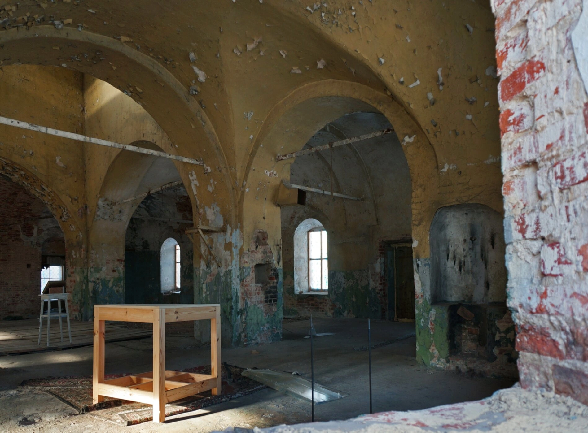 Естественное освещение проникает сквозь арочные оконные проемы, создавая драматическую игру света и тени в пространстве храма. В центральной части помещения сохранился простой деревянный стол, а в глубине можно различить очертания старинной печи или камина. На каменном полу видны многочисленные фрагменты строительных материалов и следы разрушений.