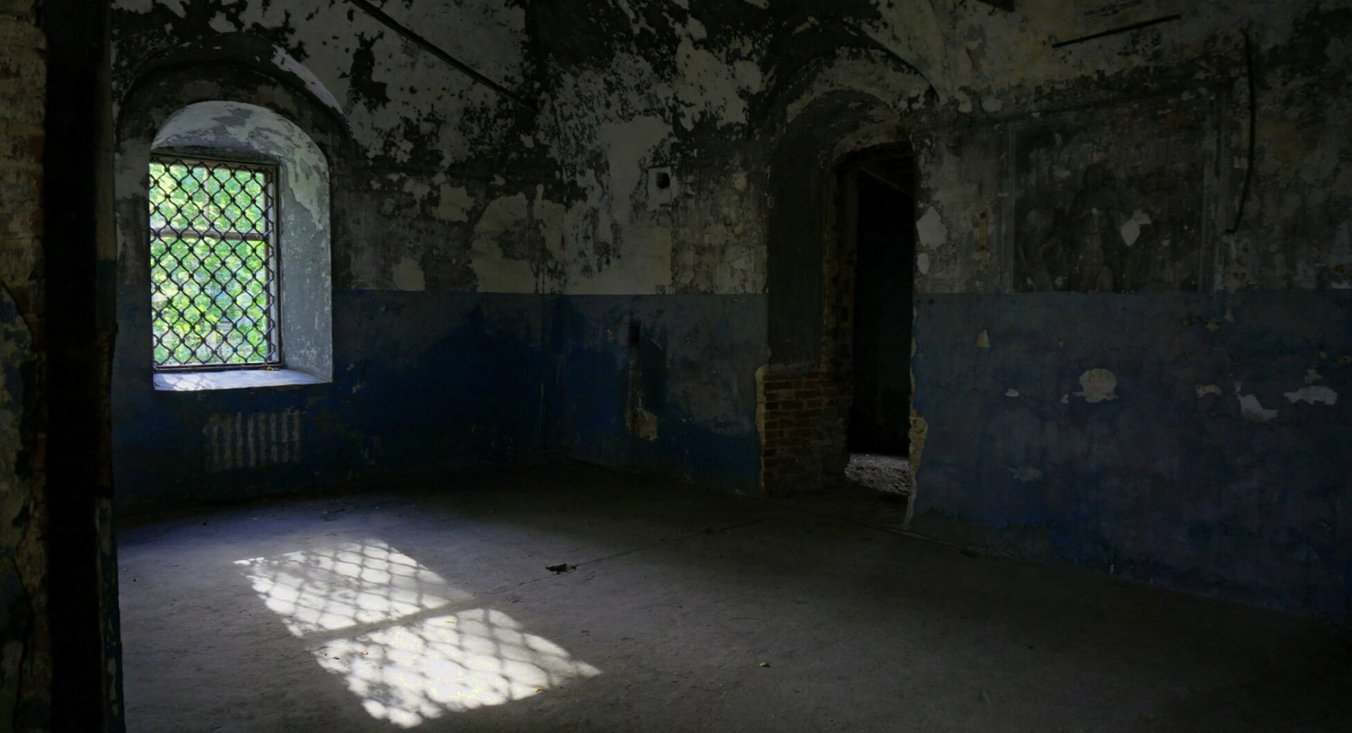 Каменный пол равномерно покрыт слоями пыли и следы времени, что в совокупности с общим состоянием интерьера создает атмосферу забытости и утраты былого величия этой православной святыни.