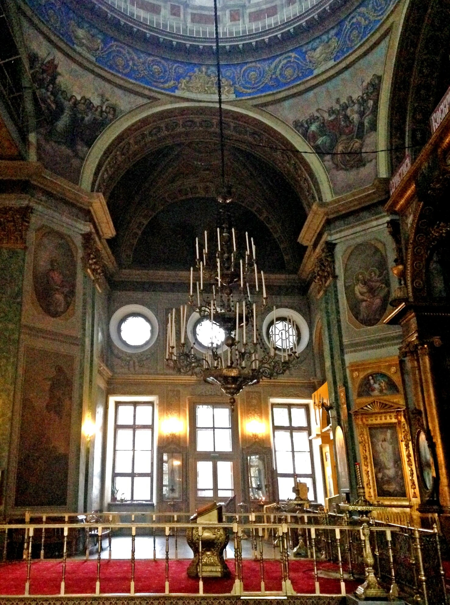 Взгляд невольно устремляется ввысь, к подкупольному пространству ротонды, украшенной богодухновенными фресками. Росписи купола и сводов изображают священные события и лики угодников Божиих, создавая особую молитвенную атмосферу. Освещает это благолепие массивная многоярусная паникадило, чей свет символизирует Божественный свет, просвещающий всякого человека.