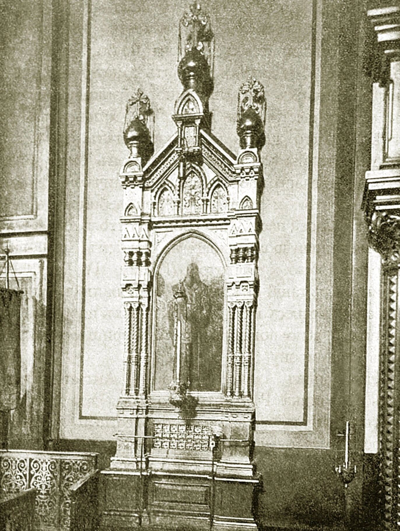Чёрно-белое исполнение фотографии подчёркивает монументальность архитектурных форм и контраст света и тени, играющий на резных поверхностях, что создаёт ощущение timelessности и вечной молитвы, застывшей в камне и дереве. Этот исторический снимок позволяет нам стать свидетелями нетленной красоты и благодати, наполнявшей этот храм до периода лихолетий, и является ценным документом, сохраняющим память о духовном и культурном наследии Санкт-Петербурга.