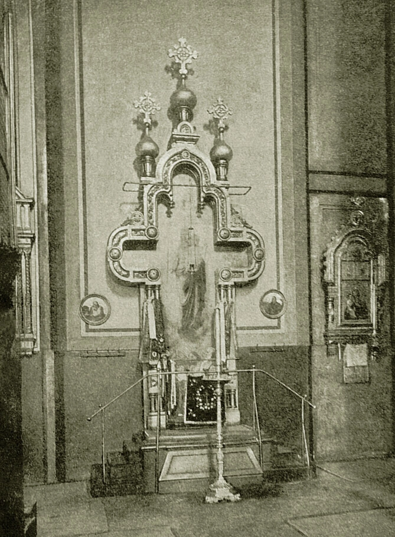 На представленной фотографии запечатлён интерьер домового храма во имя святого мученика Мирония, расположенного в главном здании Лейб-гвардии Егерского полка в Санкт-Петербурге. Снимок детально передаёт убранство одного из приделов или алтарного пространства, характерное для православной церковной архитектуры второй половины XIX века.