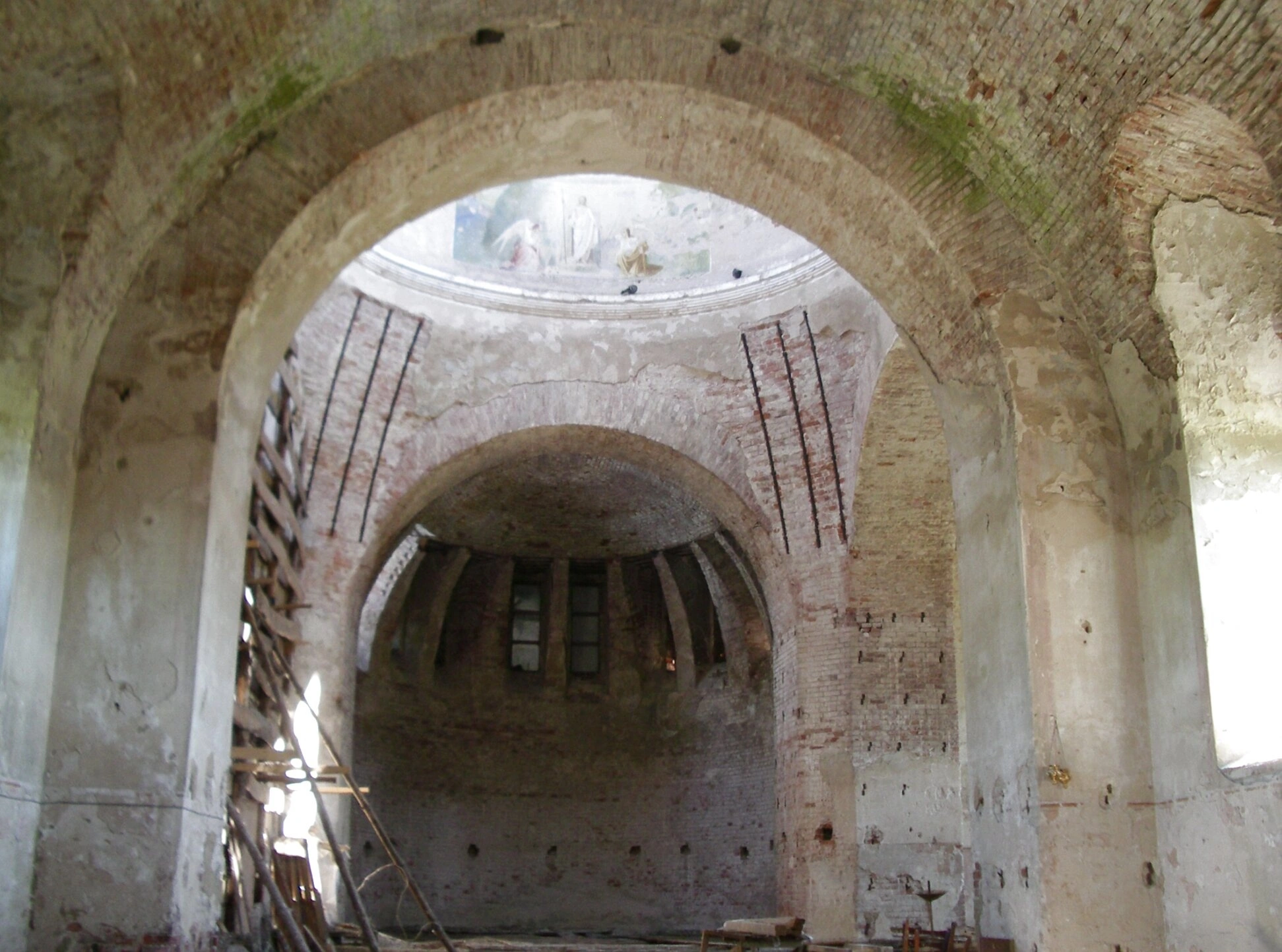 Взору открывается высокое пространство основного объёма храма, где центральное место занимают могучие кирпичные своды и подпружные арки, на которые некогда опирался световой барабан купола. Несмотря на разруху, в архитектурных формах угадывается строгая красота и чёткость пропорций, характерная для русского храмового строительства.