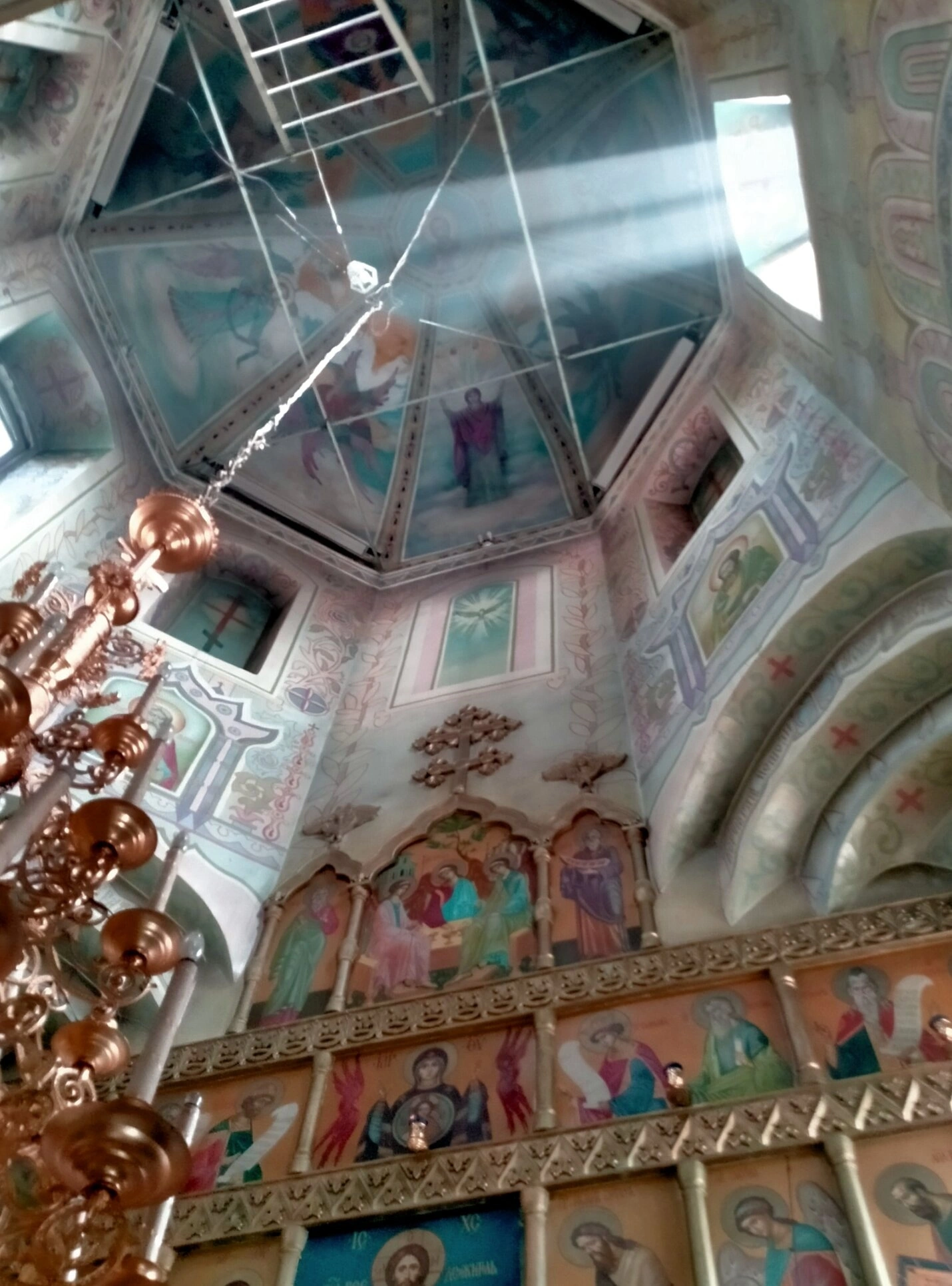 Освещение храма обеспечивает массивное паникадило, расположенное слева в кадре. Особую атмосферу создает луч естественного света, проникающий через оконный проем в куполе и освещающий центральную часть помещения, что символически указывает на божественное присутствие.