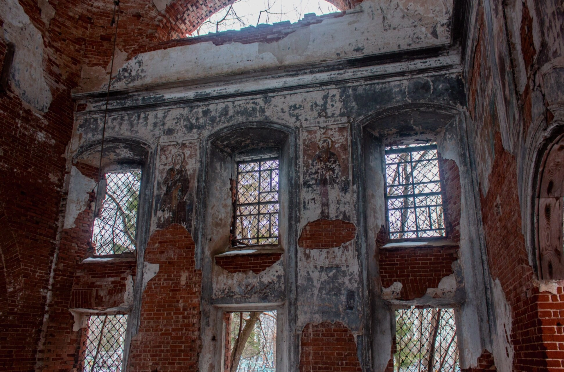 Сводчатый потолок храма значительно пострадал от разрушения, обнажив кирпичную кладку и деревянные конструкции. Это печальное зрелище напоминает о хрупкости земного бытия и необходимости сохранения духовного наследия.