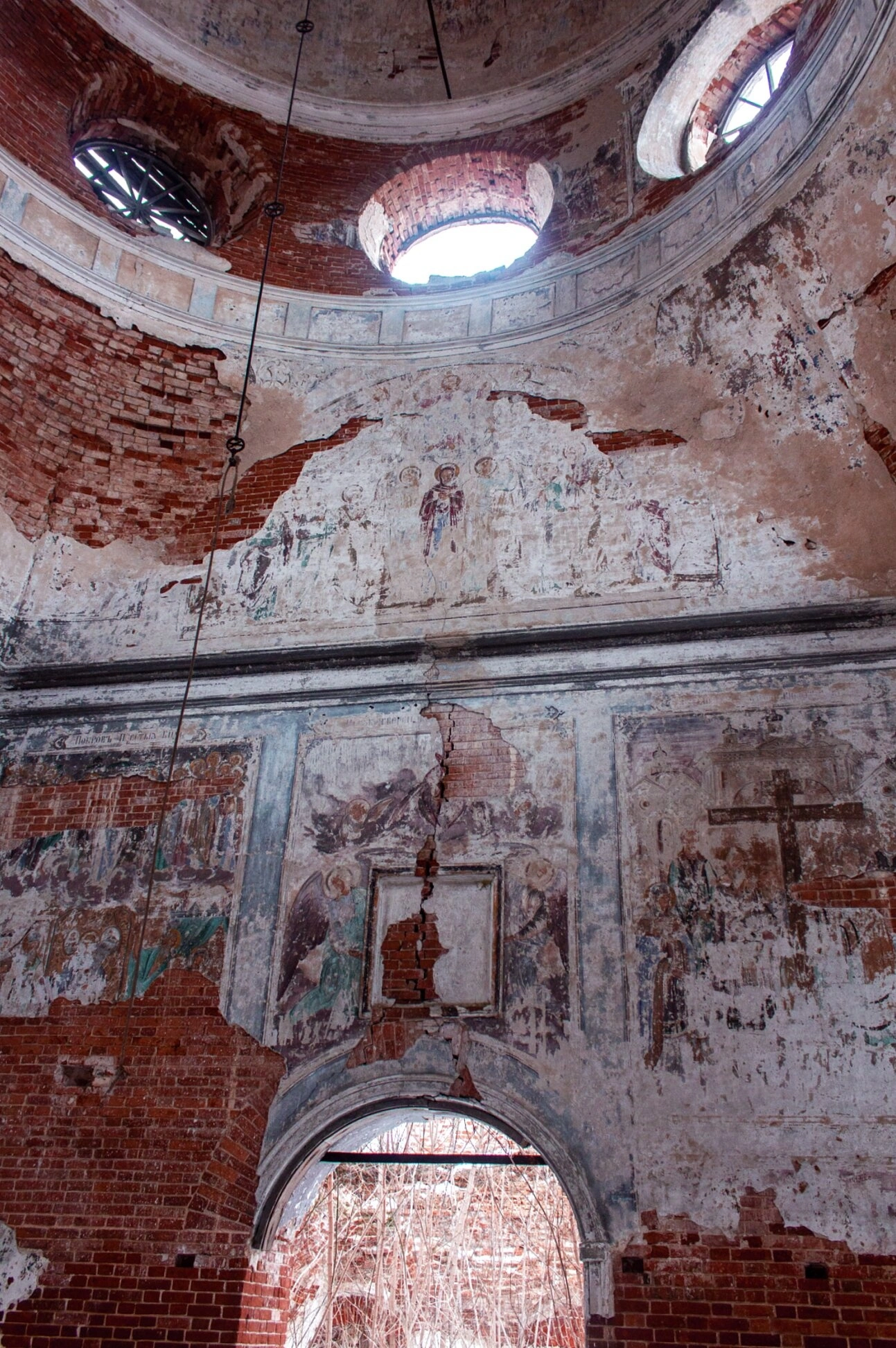 Сквозь проломы в куполе проникает естественный свет, освещая фрагменты сохранившихся стен и архитектурных элементов. На стенах угадываются следы былой росписи, свидетельствующие о том, что этот храм когда-то был богато украшен в традициях православного церковного искусства. Состояние внутреннего убранства говорит о длительном периоде запустения и требует серьезных восстановительных работ.