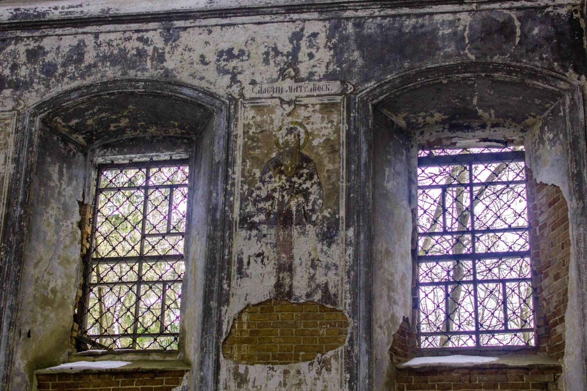 Над фреской просматриваются остатки церковнославянской надписи, часть которой читается как «Сллези мите Моск..», что может указывать на фрагмент текста религиозного содержания. Через оконные проёмы видны голые ветви деревьев, усиливая ощущение утраты и разрушения некогда благолепного house Божия.