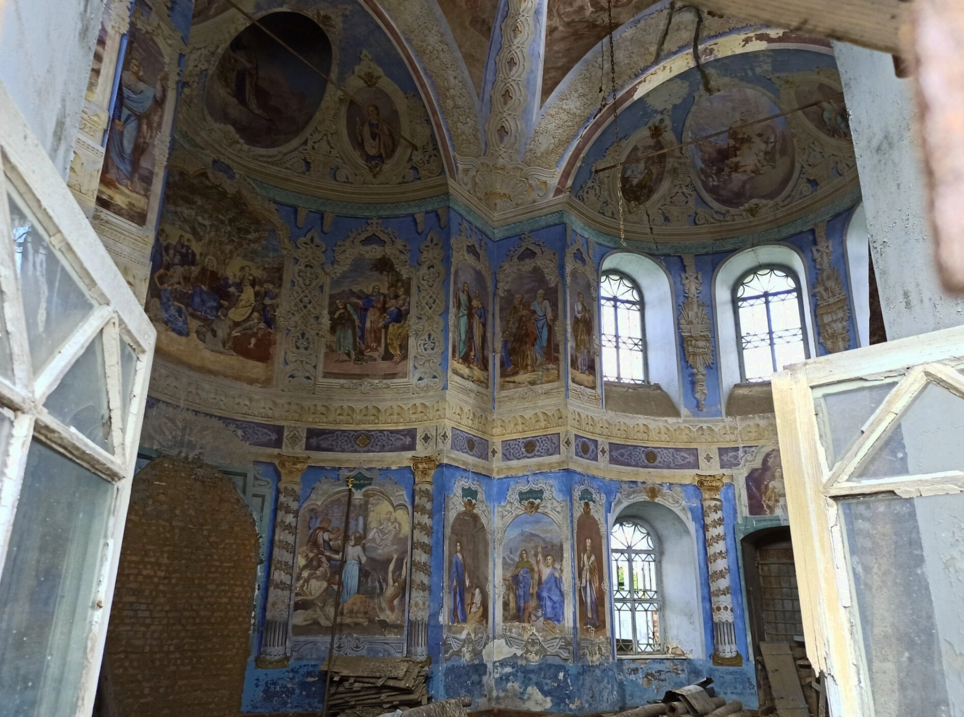 Особое внимание на фотографии приковывают хорошо сохранившиеся композиции на евангельские сюжеты и образы святых, выполненные в традиционной манере русской церковной живописи. Росписи покрывают все плоскости интерьера, создавая особую молитвенную атмосферу. Сквозь оконные проёмы, также видные на снимке, в пространство храма проникает естественный свет, освещая лики святых и подчёркивая богатство красок.