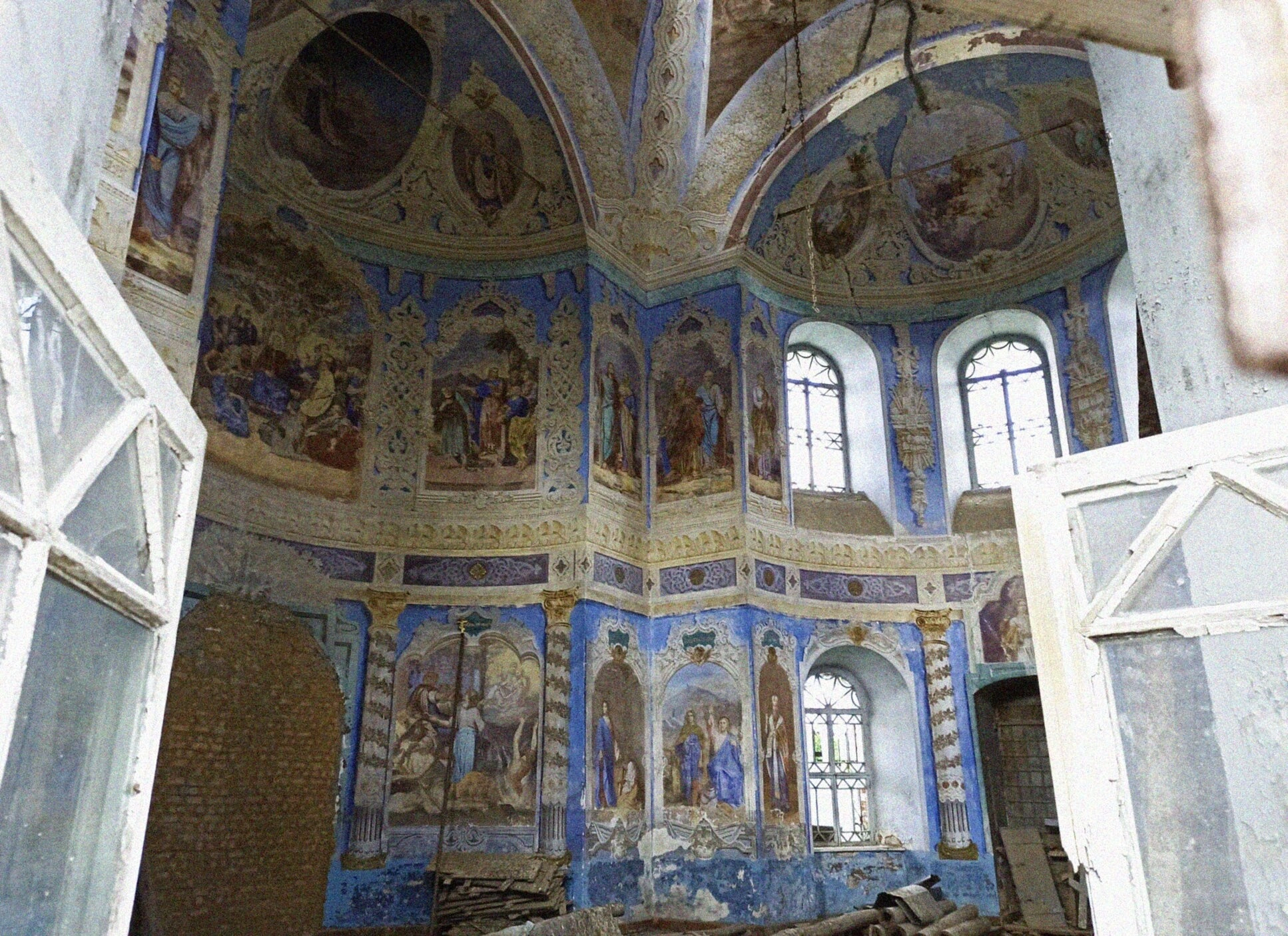 На представленной фотографии запечатлён интерьер храма Святой Живоначальной Троицы, что расположен в селе Верхне-Никульское Некоузского района Ярославской области. Снимок позволяет созерцать благодатное пространство церковного придела, пребывающее ныне в состоянии благородного запустения. Несмотря на повреждения, на стенах и сводах чудом сохранились уникальные настенные росписи, являющие собой образец высокого церковного искусства.