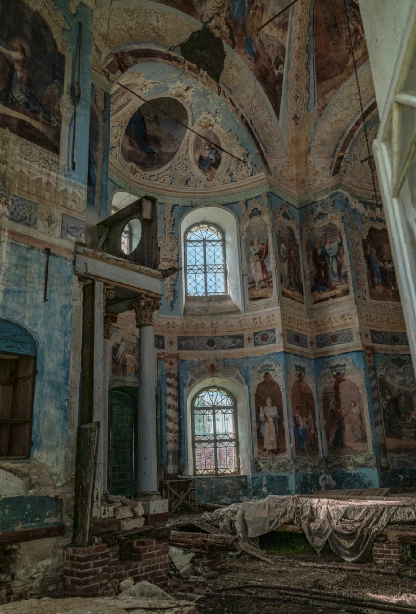 Естественный свет, льющийся извне, мягко высвечивает детали убранства: могучие колонны, поддерживающие арки, и высокие оконные проёмы с арочными завершениями, характерными для русской церковной архитектуры. На каменном полу виднеются фрагменты утвари и остатки тканей, напоминающие о былой жизни этого священного места.