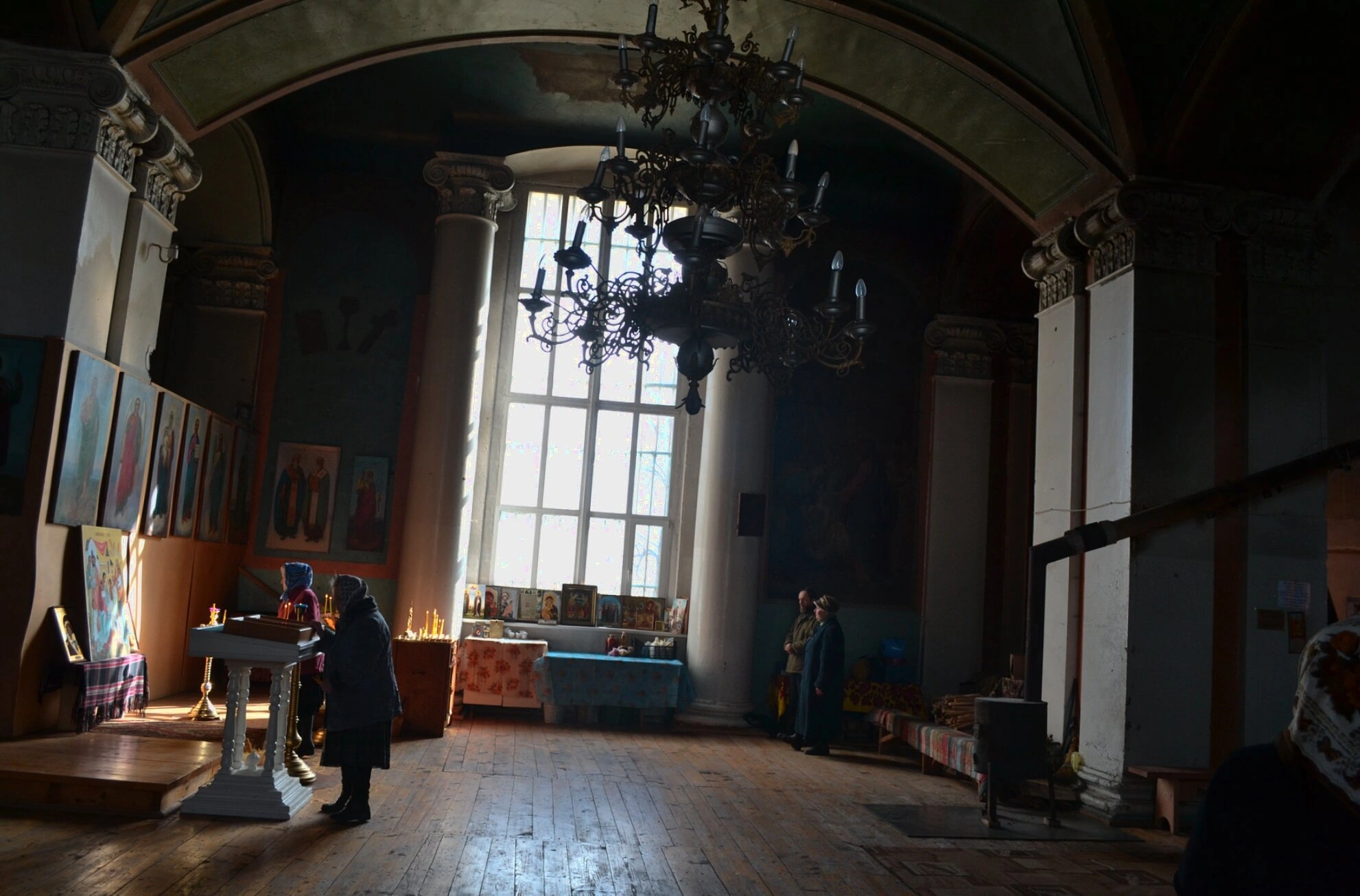 С левой стороны обращают на себя внимание святые иконы, размещённые на стенах и на аналоях — специальных высоких столиках для богослужебных книг и праздничных образов. У одного из аналоев запечатлён человек в тёмной одежде, вероятно, прихожанин или церковный служитель, погружённый в молитвенное созерцание. Рядом с ним установлен подсвечник, предназначенный для возжжения свечей — видимого знака нашей молитвы и жертвы Богу.