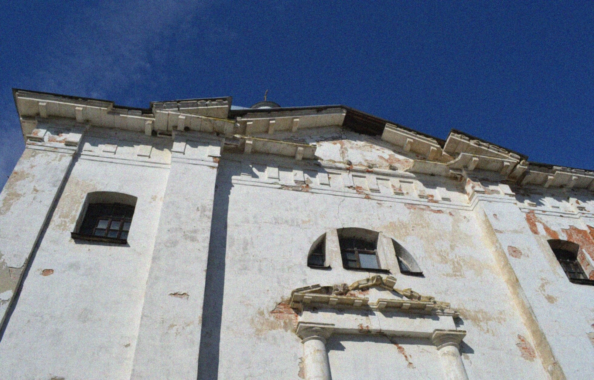 В центральной части кадра возвышаются две массивные каменные колонны, увенчанные выразительными капителями, которые поддерживают сводчатые перекрытия храма. Стены помещения богато украшены старинными фресковыми росписями, изображающими лики святых и библейские сюжеты. К сожалению, время и отсутствие полноценной реставрации привели к значительному повреждению живописного слоя: местами заметны осыпи краски, потемнения и утраты.