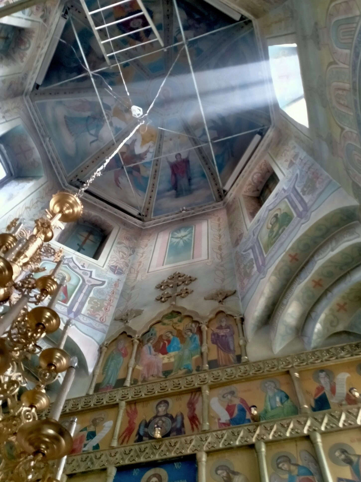 Через оконные проемы в барабане купола проникают потоки естественного света, создающие возвышенную атмосферу и подчеркивающие духовную символику храмового пространства. Световые блики эффектно выделяют детали настенной живописи, усиливая восприятие сакрального пространства.